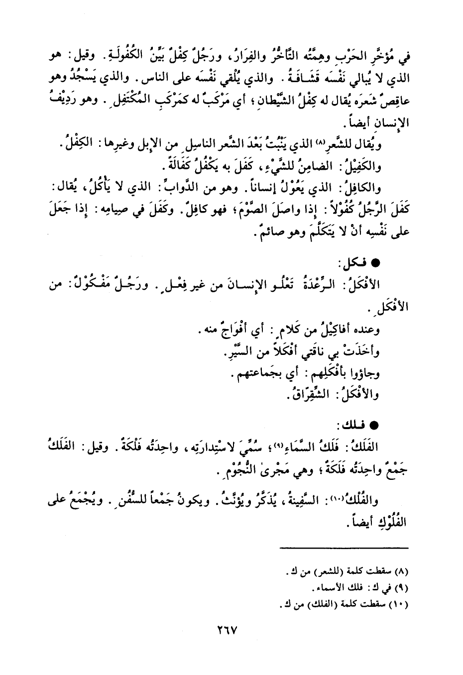 في مُؤخرِ الحَرْبِ وهِمَّتُه التَأخرُ والفِرَارُ ، ورَجُل كِفْلٌ بَيَّنُ الكُفُولَةِ . وقيل : هو الذي لا يُبالي نَفْسَه قَشَافَةُ . والذي يُلْقي نَفْسَه على الناس . والذي يَسْجُدُ وهو عاقِصٌ شَعرَه يُقال له كِفْلُ الشَّيْطانِ أي مَرْكَبٌ له كمَرْكَبِ المُكْتَفِل . وهو رَدِيْفُ الإِنسانِ أيضاً . ويُقال للشَّعرِ الذي يَنْبُتُ بَعْدَ الشَّعر الناسِل من الإِبل وغيرِها : الكِفْلُ . والكَفِيْلُ : الضامِنُ للشَّيْ ، كَفَلَ به يَكْفُلُ كَفَالَةً . والكافِلُ : الذي يَعُوْلُ إنساناً . وهو من الدَّوابِّ : الذي لا يَأكُلُ ، يُقال : كَفَلَ الرَّجُلُ كُفُوْلاً : إذا واصَلَ الصَّوْمَ فهو كافِلٌ . وكَفَلَ في صِيامِه : إِذا جَعَلَ على نَفْسِه أنْ لا يَتَكلَّمَ وهو صائمٌ . فكل الأفْكَلُ : الرِّعْدَة تَعْلُو الإنسانَ من غير فِعْل . ورَجُلٌ مَفْكُوْلٌ : من الأفْكَلَ . وعنده أفاكِيْلُ من كَلام : أي أفْوَاجٌ منه . وأخَذَتْ بي ناقَتي أفْكَلاً من السَّيْرِ . وجاؤوا بأفْكَلِهم : أي بجَماعتهم . والأفْكَلُ : الشِّقِرّاق . فلك الفَلَكُ : فَلَكُ السَّمَاءِ سُمِّيَ لاسْتِدارَتِه ، واحِدَتُه فَلْكَةٌ . وقيل : الفَلَكُ جَمْعٌ واحِدَتُه فَلَكَةٌ وهي مَجْرى النُّجُوْم . والفُلْكُ : السَّفِينةُ ، يُذَكَرُ ويُؤنَّث . ويكونُ جَمْعاً للسٌّفُن . ويُجْمَعُ على الفُلُوْكِ أيضاً .