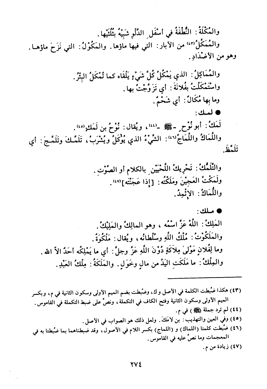 والمُكْلَةُ : النُّطْفَةُ في أسْفَل الدَّلْوِ شَبِيْة بثُلُثَيْها . والمُمَكّلُ من الآبار : التي فيها ماؤها . والمَكُوْلُ : التي نَزَحَ ماؤها . وهو من الأضْدَادِ . والمُمَاكِلُ : الذي يَمْكُلُ كلَّ شَيْءٍ يَلْقَاه كما تُمْكَلُ البِئْرُ . واسْتَمْكَلْتُ بفُلانَةَ : أي تَزَوَّجْتُ بها . وما بِها مُكَالٌ : أي شَحْمٌ . لمك لَمَكُ : أبو نُوْح ـ صلى الله عليه وسلم ـ ، ويُقال : نُوْحُ بن لَمَكٍ . واللَّمَاكُ واللَّمَاجُ : الشَّيْءُ الذي يُؤْكَلُ ويُشْرَبُ ، تَلَمَّكَ وتَلمَّجَ : أي تَلَمَّظَ . والتَّلَمُّكُ : تَحْرِيكُ اللَّحْيَيْن بالكلام أو الصَّوْتِ . ولَمَكْتُ العَجِيْنَ ومَلَكْتُه : إِذا عَجَنْتَه . واللُّمَاكُ : الإثْمِدُ . ملك المَلِكُ : اللهُ عَّزَ اسْمُه ، وهو المالِكُ والمَلِيْكُ . والمَلَكُوْتُ : مُلْكُ اللَّهِ وسُلْطانُه ، ويُقال : مَلْكُوَةٌ . وما لِفُلانٍ مَوْلى مِلاَكَةٍ دُوْنَ اللَّهِ عَزَّ وجل : أي ما يَمْلِكُه أحَدٌ إلاّ الله . والمِلْكُ : ما مَلَكَتِ اليَدُ من مالٍ وخَوَلٍ . والمَلَكَةُ : مِلْكُ العَبْدِ .