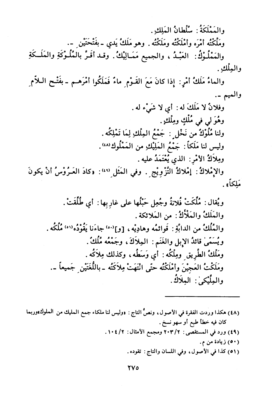 والمَمْلَكَةُ : سُلْطانُ المَلِكِ . ومّلَّكْتُه أمْرَه وأمْلَكْتُه ومَلَكْتُه . وهو مَلَكُ يَدي - بفَتْحَتَيْن - . والمَمْلُوْكُ : العَبْدُ ، والجميع مَمَالِيْكُ . وقد أقَرَّ بالمُلُوْكَةِ والمَلَكَةِ والمِلْكِ . والماءُ مَلَكُ أمْرٍ : إِذا كانَ مَعَ القَوْم ماءٌ فَمَلَكُوا أمْرَهم - بفَتْح اللاّم والميم - . وفلانٌ لا مَلَكَ له : أي لا شَيْء له . وهُوَ لي في مُلْكٍ ومِلْكٍ . ولنا مُلُوْكٌ من نَخْل : جَمْعُ المِلْكِ لِمَا تَمْلِكُه . وليس لنا مَلَكاً : جَمْعُ المَلِيْكِ من المَمْلُوك . ومِلاَكُ الأمْرِ : الذي يُعْتَمَدُ عليه . والإِمْلاكُ : إمْلاكُ التَّزْوِيْج . وفي المَثَل : ' كادَ العَرُوْسُ أنْ يكونَ مَلِكاً ' . ويُقال : مُلَّكَتْ فُلانةُ وجُعِل حَبْلُها على غارِبِها : أي طُلِّقَتْ . والمَلَكُ والمَلأكُ : من المَلائكة . والمُلُكُ من الدابَّةِ : قَوائمُه وهادِيْه ، وجاءَنا يَقُوْدُه مُلُكُه . ويُسَمّى قائدُ الإبل والغَنَم : المِلاَكَ ، وجَمْعُه مُلُكٌ . ومَلْكُ الطَّرِيق ومِلْكُه : أي وَسَطُه ، وكذلك مِلاَكُه . ومَلَكْتُ العَجِيْنَ وأمْلَكْتُه حتى انْتَهَتْ مِلاَكَتُه - باللغَتَيْن جَميعاً - . والمِلِّيْكى : المِلاكُ .