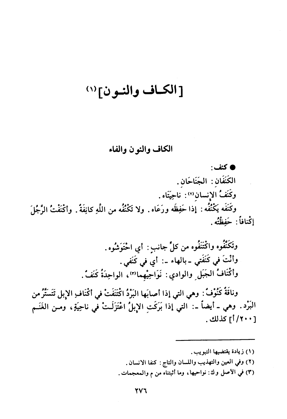 كنف الكَنَفَانِ : الجَنَاحَانِ . وكَنَفُ الإنسانِ : ناحِيَتَاه . وكَنَفَه يَكْنُفُه : إذا حَفِظَه ورَعَاه . ولا تَكْنُفه من اللَّهِ كانِفَةٌ . وأكْنَفْتُ الرَّجُلَ إكْنافاً : حَفِظْتُه . وتَكَنَّفُوه واكْتَنَفُوه من كل جانبٍ : أي احْتَوَشُوه . وأنْتَ في كَنَفَتي - بالهاء - : أي في كَنَفي . وأكْنَافُ الجَبَل والوادي : نَوَاحِيْهِما ، الواحِدَةُ كَنَفٌ . وناقَة كَنُوْفٌ : وهي التي إذا أصابَها البَرْدُ اكْتَنَفَتْ في أكْنَافِ الإبل تَتَسَتَرُ من البَرْد . وهي - أيضاً - : التي إذا بَرَكَتِ الإبلُ اعْتَزَلَتْ في ناحِيَةٍ ، ومن الغَنَم ، كذلك .