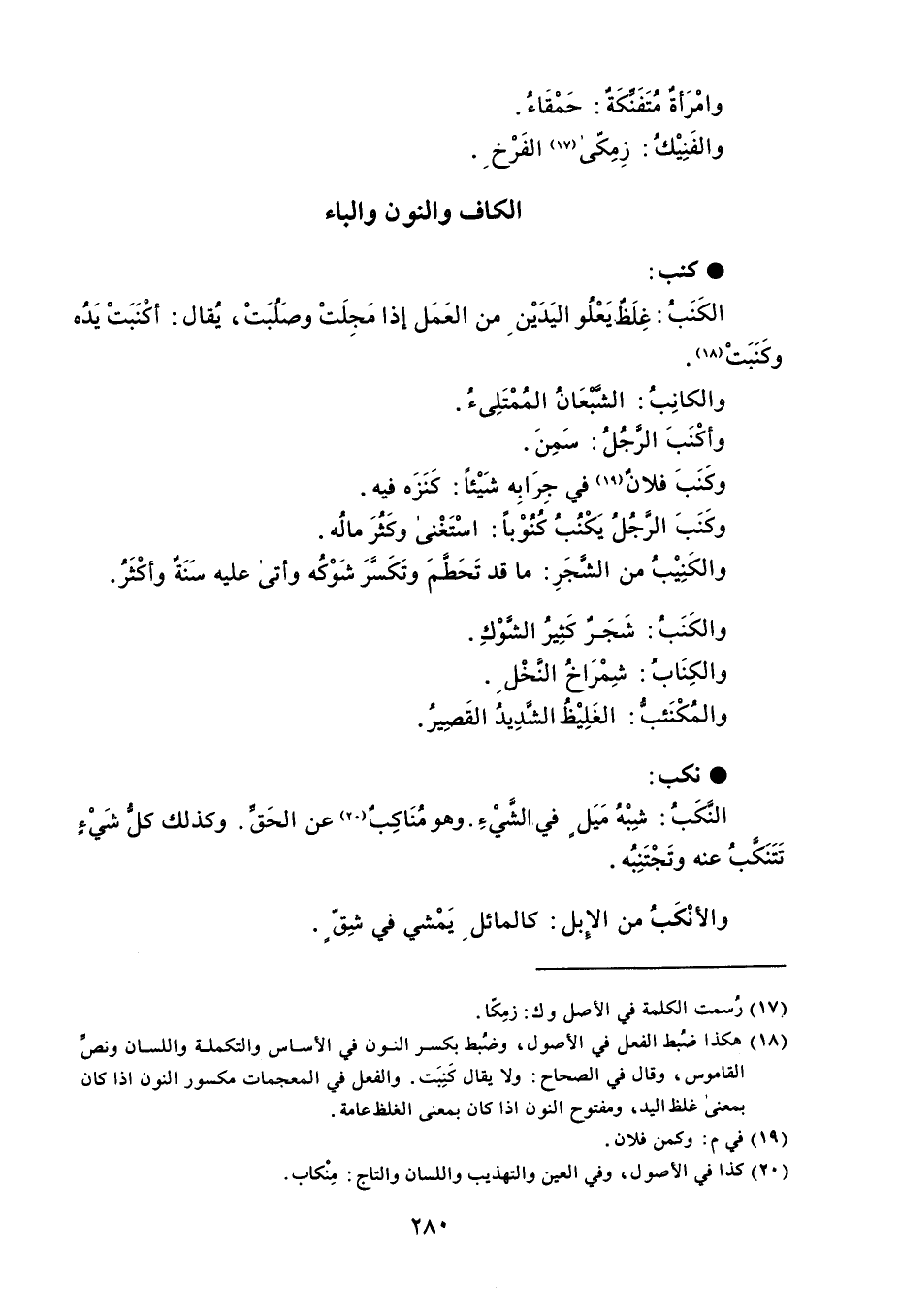 كنب الكَنَبُ : غِلَظٌ يَعْلُو اليَدَيْن من العَمَل إذا مَجِلَتْ وصَلُبَتْ ، يُقال : أكْنَبَتْ يَدُه وكَنَبَتْ . والكانِبُ : الشَّبْعَانُ المُمْتَلِىءُ . وأكْنَبَ الرَّجُلُ : سَمِنَ . وكَنَبَ فلانٌ في جِرَابِه شَيْئاً : كَنَزَه فيه . وكَنَبَ الرَّجُلُ يَكْنُبُ كُنُوْباً : اسْتَغْنى وكَثُرَ مالُه . والكَنِيْبُ من الشَّجَرِ : ما قد تَحَّطّمَ وتَكَسَّر شَوْكُه وأتى عليه سَنَةٌ وأكْثَرُ . والكَنَبُ : شَجَرٌ كَثِيرُ الشَّوْكِ . والكِنَابُ : شِمْرَاخُ النَّخْل . والمُكْنَئبُّ : الغَلِيْظُ الشَّدِيدُ القَصِيرُ . ؟ نكب النَّكَبُ : شِبْهُ مَيَل في الشَّيْءِ . وهو مُنَاكِبٌ عن الحَق . وكذلك كلُّ شَيْءٍ نَتَنكَّبُ عنه وتَجْتَنِبُه . والأنْكَبُ من الإِبل : كالمائل يَمْشي في شِقٍّ .