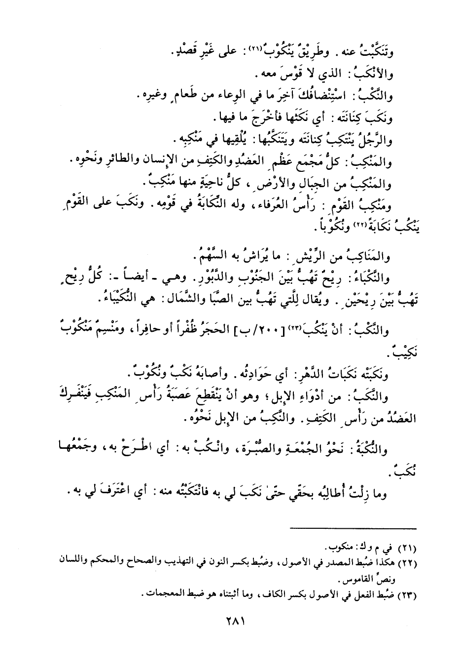 وتَنَكَّبْتُ عنه . وطَرِيْقٌ يَنْكُوْبٌ : على غَيْرِ قَصْدٍ . والأنْكَبُ : الذي لا قَوْسَ معه . والنَّكْبُ : اسْتِنْضافُكَ آخِرَ ما في الوِعاء من طَعام وغيرِه . ونَكَبَ كِنَانَتَه : أي نَكَثَها فأخْرَجَ ما فيها . والرَّجُلُ يَنْتَكِبُ كِنانَتَه ويَتَنَكَّبُها : يُلْقِيها في مَنْكِبِه . والمَنْكِبُ : كلُّ مَجْمَع عَظْم العَضُدِ والكَتِفِ من الإِنسان والطائرِ ونَحْوِه . والمَنْكِبُ من الجِبَالِ والأرْض ، كلُّ ناحِيَةٍ منها مَنْكِبٌ . ومَنْكِبُ القَوْم : رَأْسُ العُرَفاء ، وله النكَابَةُ في قَوْمِه . ونَكَبَ على القَوْم يَنْكُبُ نَكَابَةً ونُكُوْباً . والمَنَاكِبُ من الريْشِ : ما يُرَاشُ به السَّهْمُ . والنَّكْبَاءُ : رِيْحٌ تَهُبُّ بَيْنَ الجَنُوْبِ والدَّبُوْرِ . وهي - أيضاً - : كُل رِيْح تَهُبُّ بَيْنَ رِيْحَيْن . ويُقال لِلَّتي تَهُبُّ بين الصَّبَا والشِّمَال : هي النُكَيْبَاءُ . والنَّكْبُ : أنْ يَنْكُبَ الحَجَرُ ظُفْراً أو حافِراً ، ومَنْسِمٌ مَنْكُوْبٌ نَكِيْبٌ . ونَكَبَتْه نَكَبَاتُ الدَّهْرِ : أي حَوَادِثُه . وأصابَهُ نَكْبٌ ونُكُوْبٌ . والنَّكَبُ : من أدْوَاءِ الإِبل وهو أنْ يَنْقَطِعَ عَصَبَةُ رَأس المَنْكِبِ فَيَنْفَرِكَ العَضُدُ من رَأس الكَتِفِ . والنَّكِبُ من الإِبل نَحْوُه . والنُكْبَةُ : نَحْوُ الجُمْعَةِ والصُّبْرَة ، وانْكُبْ به : أي اطْرَحْ به ، وجَمْعُها نُكَبٌ . وما زِلْتُ أُطالِبُه بحَقّي حتّى نَكَبَ لي به فانْتَكَبْتُه منه : أي اعْتَرَفَ لي به .
