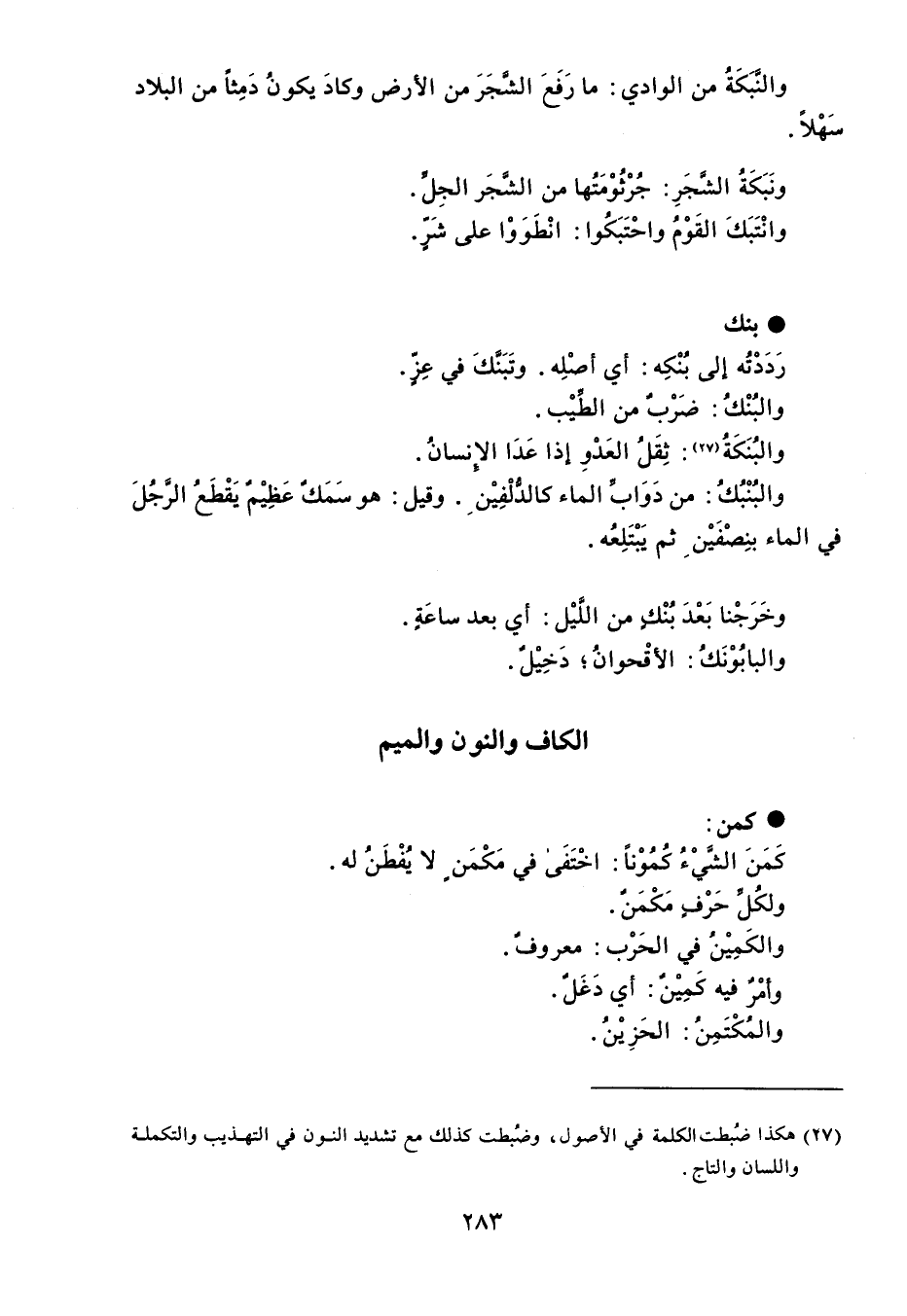 والنَّبَكَةُ من الوادي : ما رَفَعَ الشَّجَرَ من الأرض وكادَ يكونُ دَمِثاً من البلاد سَهلاً . ونَبَكَةُ الشَّجَرِ : جُرْثُوْمَتُها من الشَّجَر الجِلِّ . وانْتَبَكَ القَوْمُ واحْتَبَكُوا : انْطَوَوْا على شَرٍّ . بنك رَدَدْتُه إلى بُنْكِه : أي أصْلِه . وتَبَنَكَ في عِزٍّ . والبُنْكُ : ضَرْبٌ من الطِّيْب . والبُنَكَةُ : ثِقَلُ العَدْوِ إذا عَدَا الإنسانُ . والبُنْبُكُ : من دَوَابِّ الماء كالدُّلْفِيْن . وقيل : هو سَمَكٌ عَظِيْمٌ يَقْطَعُ الرَّجُلَ في الماء بنِصْفَيْن ثم يَبْتَلِعُه . وخرَجْنا بَعْدَ بُنْكٍ من اللَّيْل : أي بعد ساعَةٍ . والبابُوْنَكُ : الأقْحوانُ دَخِيْلٌ .