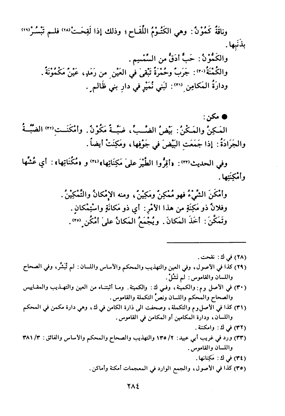 وناقَةٌ كَمُوْن : وهي الكَتُوْمُ اللِّقَاح وذلك إذا لَقِحَتْ فلم تَبْسُرْ بذَنَبِها . والكَمُّوْنُ : حَبٌّ أدَقُّ من السِّمْسِم . والكُمْنَةُ : جَرَبٌ وحُمْرَةٌ تَبْقى في العَيْن من رَمَدٍ ، عَيْنٌ مَكْمُوْنَةٌ . ودارَةُ المَكامِن : لبَني نُمَيْرٍ في دارِ بني ظَالمٍ . مكن المَكِنُ والمَكْنُ : بَيْضُ الضَّبِّ ، ضَبَّةٌ مَكُوْنٌ . وأمْكَنَتِ الضَّبَّةُ والجَرَادَةُ : إذا جَمَعَتِ البَيْضَ في جَوْفِها ، ومَكِنَتْ أيضاً . وفي الحديث : ' أقِروا الطيْرَ على مَكِنَاتِها ' ، و مُكُنَاتِها : أي عُشِّها وأمْكِنَتِها . وأمْكَنَ الشَّيْءُ فهو مُمْكِنٌ ومَكِيْنٌ ، ومنه الإمْكانُ والتَمْكِيْنُ . وفلانٌ ذو مَكِنَةٍ من هذا الأمْرِ : أي ذو مَكانَةٍ واسْتِمْكانٍ . وتَمَكَّنَ : أخَذَ المَكانَ . ويُجْمَعُ المَكانُ على أمْكُن .