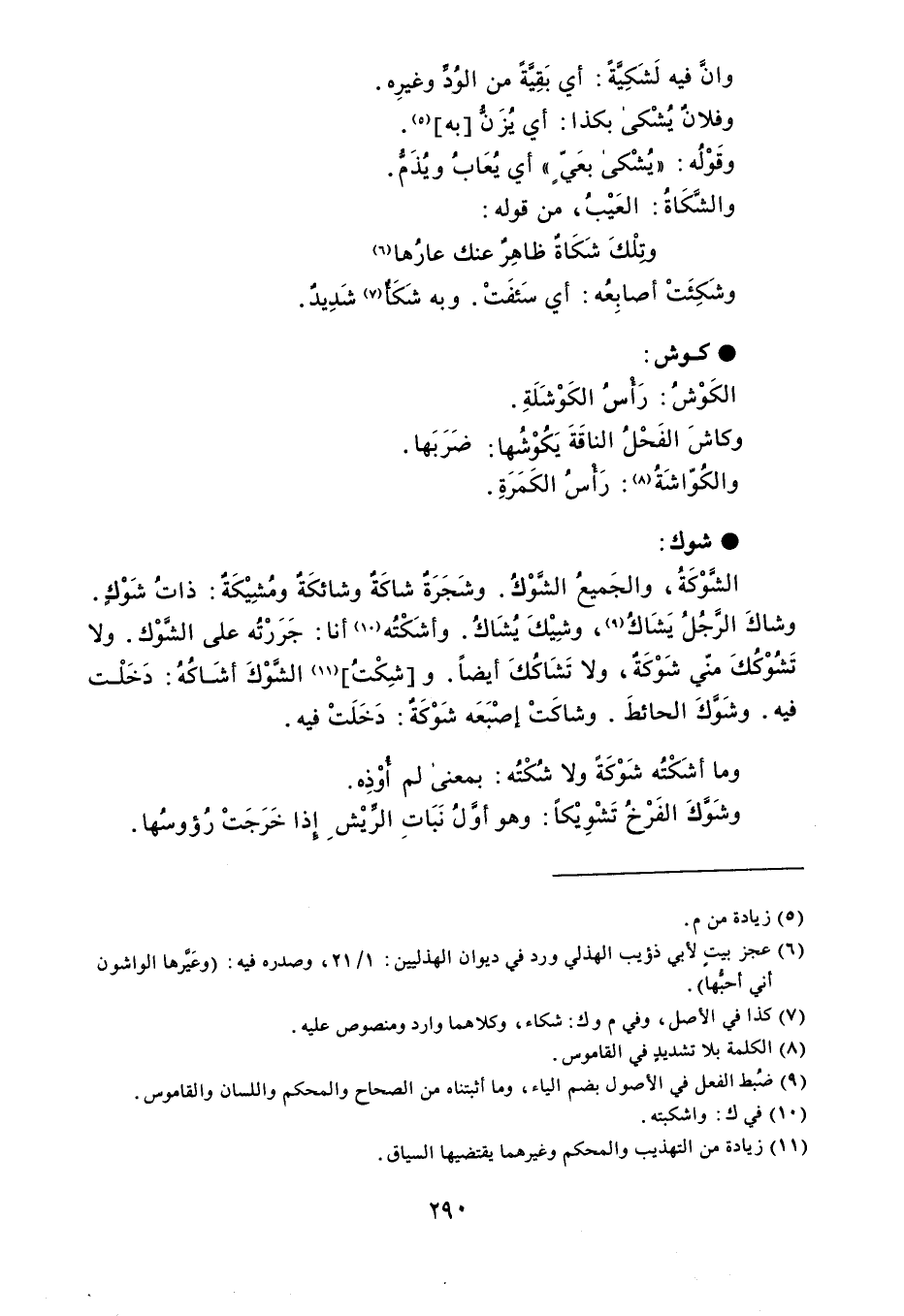 وانَّ فيه لَشَكِيَّةً : أي بَقِيَّةً من الوُدِّ وغيرِه . وفلانُ يُشْكى بكذا : أي يُزَنُّ به . وقَوْلُه : يُشْكى بعَيّ أي يُعَابُ ويُذَمُّ . والشِّكَاةُ : العَيْبُ ، من قوله : وتلْكَ شَكَاة ظاهِرٌ عنك عارُها وشَكِئَتْ أصابِعُه : أي سَئفَتْ . وبه شَكَأٌ شَدِيدٌ . كوش الكَوْشُ : رَأسُ الكَوْشَلَةِ . وكاشَ الفَحْلُ الناقَةَ يَكُوْشُها : ضَرَبَها . والكُوّاشَةُ : رَأسُ الكَمَرَةِ . شوك الشَّوْكَةُ ، والجَميعُ الشَّوْكُ . وشَجَرَةٌ شاكَةٌ وشائكَةٌ ومُشِيْكَةٌ : ذاتُ شَوْكٍ . وشاكَ الرَّجُلُ يَشَاكُ ، وشِيْكَ يُشَاكُ . وأشَكْتُه أنا : جَرَرْتُه على الشَّوْك . ولا تَشُوْكُكَ منّي شَوْكَةٌ ، ولا تَشَاكُكَ أيضاً . وشِكْتُ الشَّوْكَ أشَاكُهُ : دَخَلْت فيه . وشَوَّكَ الحائطَ . وشاكَتْ إصْبَعَه شَوْكَةٌ : دَخَلَتْ فيه . وما أشَكْتُه شَوْكَةً ولا شُكْتُه : بمعنى لم أُوْذِه . وشَوَّكَ الفَرْخُ تَشْوِيْكاً : وهو أوَّلُ نَبَاتِ الرِّيْش إِذا خَرَجَتْ رُؤوسُها .