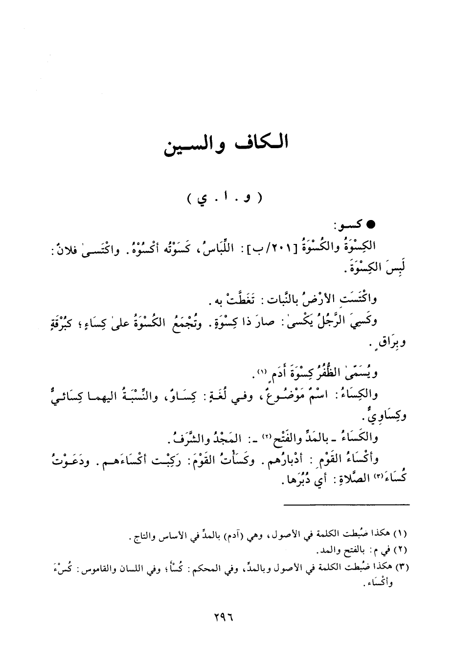 كسو الكِسْوَةُ والكُسْوَة : اللِّبَاسُ ، كَسَوْتُه أكسُوْهُ . واكْتَسى فلان : لبسَ الكِسْوَةَ . واكْتَسَتِ الأرْضُ بالنَّبات : تَغَطَّتْ به . وكَسِيَ الرَّجُلُ يَكْسى : صارَ ذا كِسْوَةٍ . وتُجْمَعُ الكُسْوَةُ على كِسَاءٍ ، كبُرْقَةٍ وبِرَاقً . ويُسَمّى الظُّفُرُ كِسْوَةَ أَدَمٍ . والكِسَاءُ : اسْمٌ مَوْضُوعٌ ، وفي لُغَةٍ : كِسَاوٌ ، والنَسْبَةُ إليهما كِسَائيٌّ كِسَاوِيٌّ . والكَسَاءُ - بالمَدَّ والفَتْح - : المَجْدُ والشَّرَفُ . وأكْسَاءُ القَوْم : أدْبارُهم . وكَسَأْتُ القَوْمَ : رَكِبْت أكْسَاءَهم . ودَعَوْتُ كُسَاءَ الصَلاةِ : أي دُبُرَها .