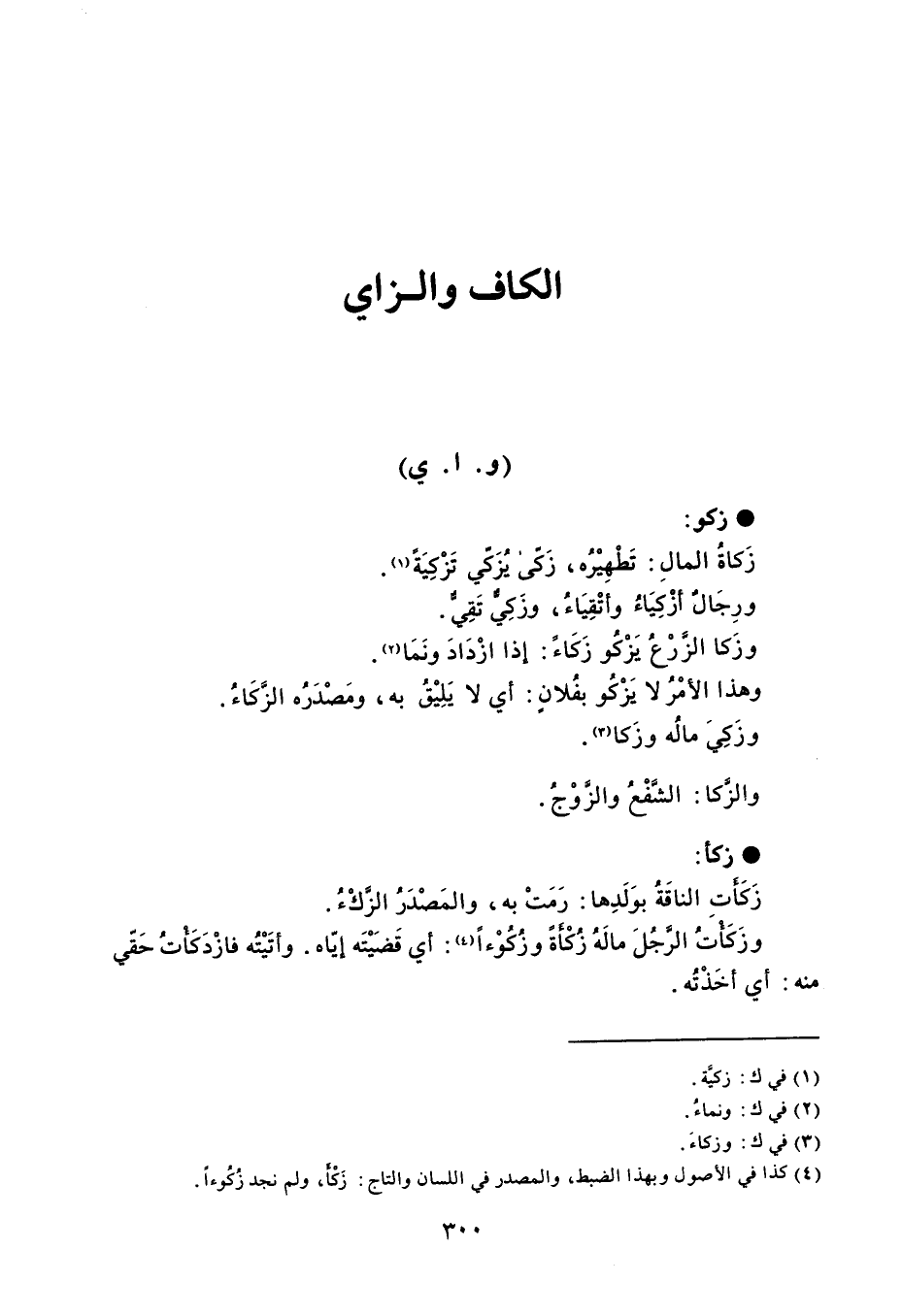 زكو زَكاةُ المالِ : تَطْهِيْرُه ، زَكّى يُزَكي تَزْكِيَةً . ورِجَالٌ أزْكِيَاءُ وأتْقِيَاءُ ، وزَكِي تَقِيٌّ . وزَكا الزَّرْعُ يَزْكو زَكَاءً : إذا ازْدَادَ ونَمَا . وهذا الأمْرُ لا يَزْكُو بفُلانٍ : أي لا يَلِيْقُ به ، ومَصْدَرُه الزَّكَاءُ . وزَكِيَ مالُه وزَكا . والزَّكا : الشَّفْعُ والزَّوْجُ . زكأ زَكَأتِ الناقَةُ بوَلَدِها : رَمَتْ به ، والمَصْدَرُ الزَّكْءُ . وزَكَأْتُ الرَّجُلَ مالَهُ زُكْاةً وزُكُوْءاً : أي قَضَيْتَه إيّاه . وأتَيْتُه فازْدَكَأتُ حَقّي منه : أي أخَذْتُه .