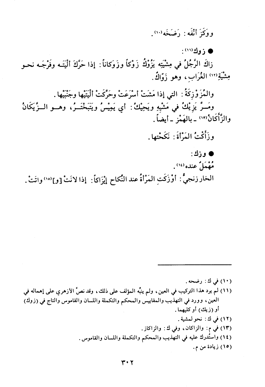 ووَكَزَ أنْفَه : رَضَخَه . زوك زاكَ الرَّجُلُ في مِشْيَتِه يَزُوْك زَوْكاً وزَوَكاناً : إذا حَركَ ألْيَتَه وفَرْجَه نحو مِشْيَةِ الغُرَابِ ، وهو زَوّاكٌ . والمُزَوْزِكَةُ : التي إذا مَشَتْ أسْرَعَتْ وحَرَّكَتْ ألْيَتَيْها وجَنْبَيْها . ومَرَّ يَزِيْكُ في مَشْيِهِ ويَحِيْكُ : أي يَمِيْسُ ويَتَبَخْتَرُ ، وهو الزَّيَكَانُ والزَّأَكَانُ - بالهَمْز - أيضاً . وزَأَكْتُ المَرْأةَ : نَكَحْتها . وزك مُهْمَل عنده . الخارزنجيُّ : أوْزَكَتِ المَرْأةُ عند النِّكاح إيْزَاكاً : إذا لانَتْ وواتَتْ .