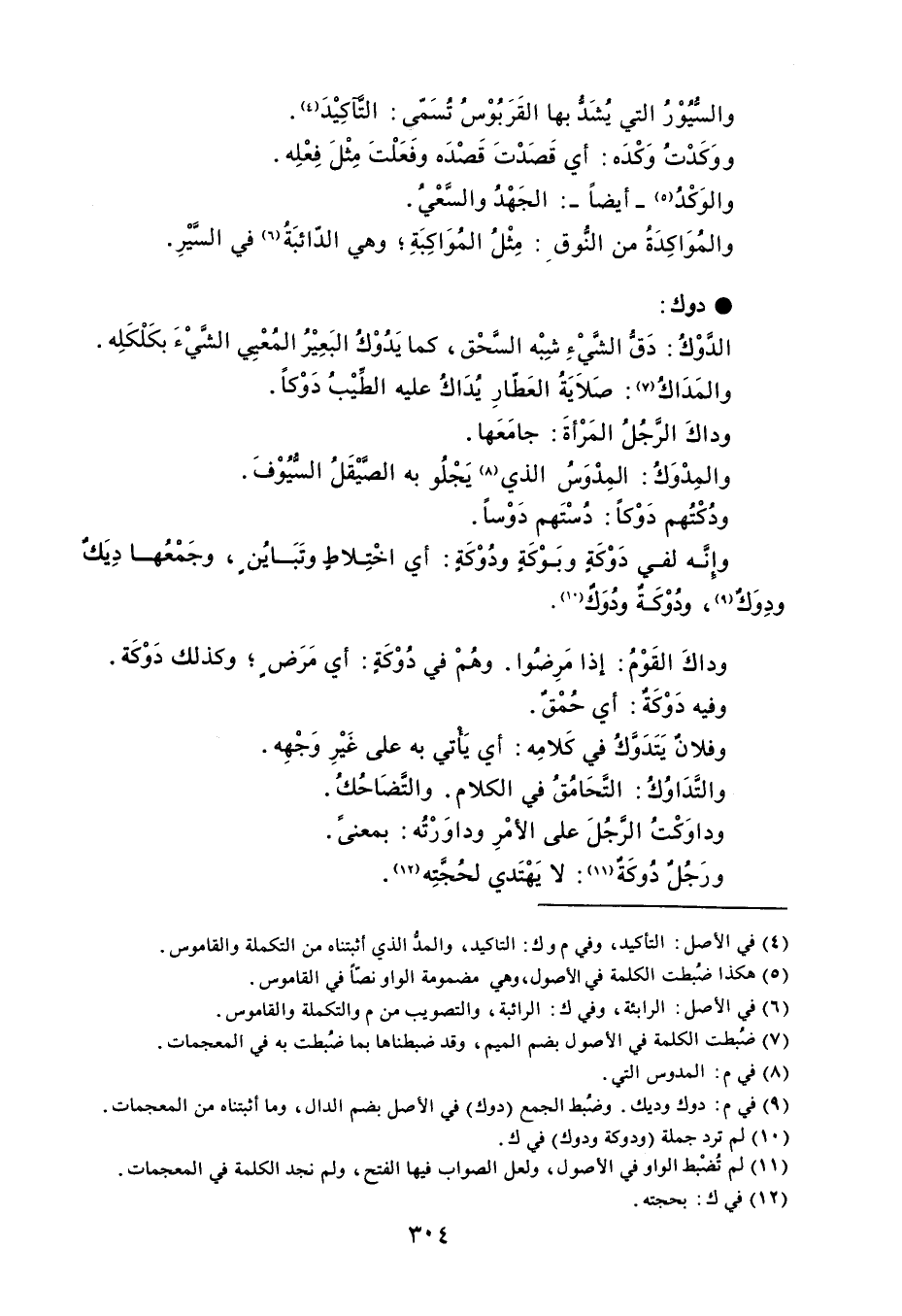 والسُّيُوْرُ التي يُشَدُّ بها القَرَبُوْسُ تُسَمّى : التآكِيْدَ . ووَكَدْتُ وَكْدَه : أي قَصَدْتَ قَصْدَه وفَعَلْتَ مِثْلَ فِعْلِه . والوَكْدُ - أيضاً - : الجَهْدُ والسَّعْيُ . والمُوَاكِدَةُ من النُّوق : مِثْلُ المُوَاكِبَةِ وهي الدّائبَةُ في السَّيْرِ . دوك الدَّوْكُ : دَقُّ الشَّيْءِ شِبْه السَّحْق ، كما يَدُوْكُ البَعِيْرُ المُعْيِي الشَّيْءَ بكَلْكَلِه . والمَدَاكُ : صَلاَيَةُ العَطّارِ يُدَاكُ عليه الطِّيْبُ دَوْكاً . وداكَ الرَّجُلُ المَرْأةَ : جامَعَها . والمِدْوَكُ : المِدْوَسُ الذي يَجْلُو به الصَّيْقَلُ السُّيُوْفَ . ودُكْتُهم دَوْكاً : دُسْتَهم دَوْساً . وإِنَّه لفي دَوْكَةٍ وبَوْكَةٍ ودُوْكَةٍ : أي اخْتِلاطٍ وتَبَايُن ، وجَمْعُها دِيَكٌ ودِوَكٌ ودُوْكَةٌ ودُوَكٌ . وداكَ القَوْمُ : إذا مَرِضُوا . وهُمْ في دُوْكَةٍ : أي مَرَضٍ وكذلك دَوْكَة . وفيه دَوْكَةٌ : أي حُمْقٌ . وفلانٌ يَتَدَوَّكُ في كَلامِه : أي يَأْتي به على غَيْرِ وَجْهِه . والتَّدَاوُكُ : التَّحَامُقُ في الكلام . والتَّضَاحُكُ . وداوَكْتُ الرَّجُلَ على الأمْرِ وداوَرْتُه : بمعنَىً . ورَجُلٌ دُوكَةٌ : لا يَهْتَدي لحُجَّتِه .