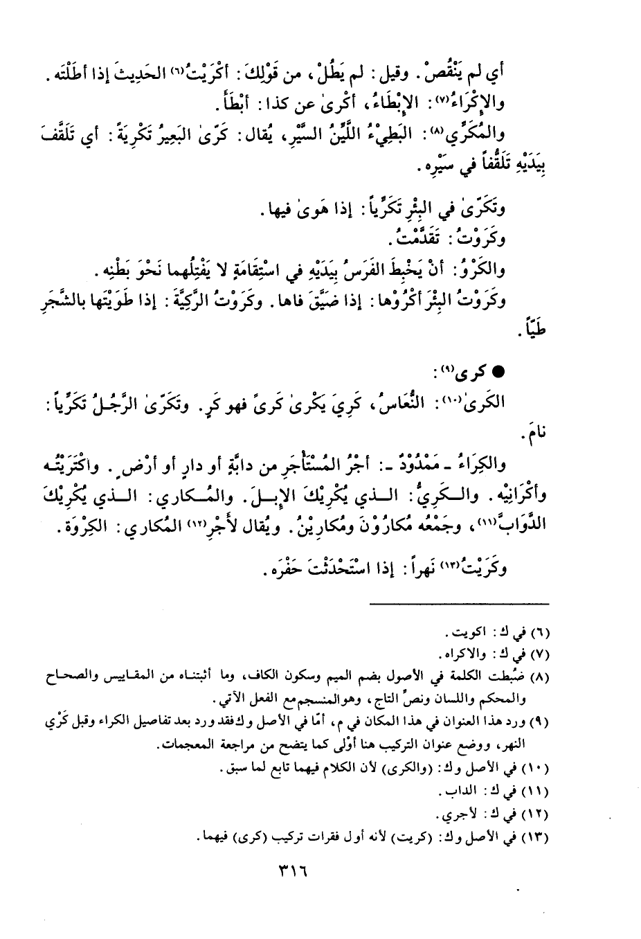 أي لم يَنْقُصْ . وقيل : لم يَطُلْ ، من قَوْلكَ : أكْرَيْتُ الحَدِيثَ إذا أطَلْتَه . والإِكْرَاءُ : الإِبْطَاءُ ، أكْرى عن كذا : أبْطَأ . والمُكَرِّي : البَطِيْءُ الَلَّيِّنُ السَّيْرِ ، يُقال : كَرّى البَعِيرُ تَكْرِيَةً : أي تَلَقَّفَ بِيَدَيْهِ تَلَقفاً في سَيْرِه . وتَكَرّى في البِئْرِ تَكَرّياً : إذا هَوى فيها . وكَرَوْتُ : تَقَدَّمْتُ . والكَرْوُ : أنْ يَخْبِطَ الفَرَسُ بِيَدَيْهِ في اسْتِقَامَةٍ لا يَفْتِلُهما نَحْوَ بَطْنِه . وكَرَوْتُ البِئْرَ أكْرُوْها : إذا ضَيَّقَ فاها . وكَرَوْتُ الرَّكِيَّةَ : إذا طَوَيْتَها بالشَّجَرِ طَيّاً . كرى الكَرى : النُّعَاسُ ، كَرِيَ يَكْرى كَرىً فهو كَرٍ . وتَكَرّى الرجُلُ تَكَرياً : نامَ . والكِرَاءُ - مَمْدُوْدٌ - : أجْرُ المستأجرِ من دابَّةٍ أو دارٍ أو أرْضٍ . واكْتَرَيْتُه وأكْرَانِيْه . والكَرِيُّ : الذي يُكْرِيْكَ الإبلَ . والمُكاري : الذي يُكْرِيْكَ الدَّوَابَّ ، وجَمْعُه مُكارُوْنَ ومُكارِيْنُ . ويُقال لأجْرِ المُكاري : الكِرْوَة . وكَرَيْتُ نَهراً : إذا اسْتَحْدَثْتَ حَفْرَه .