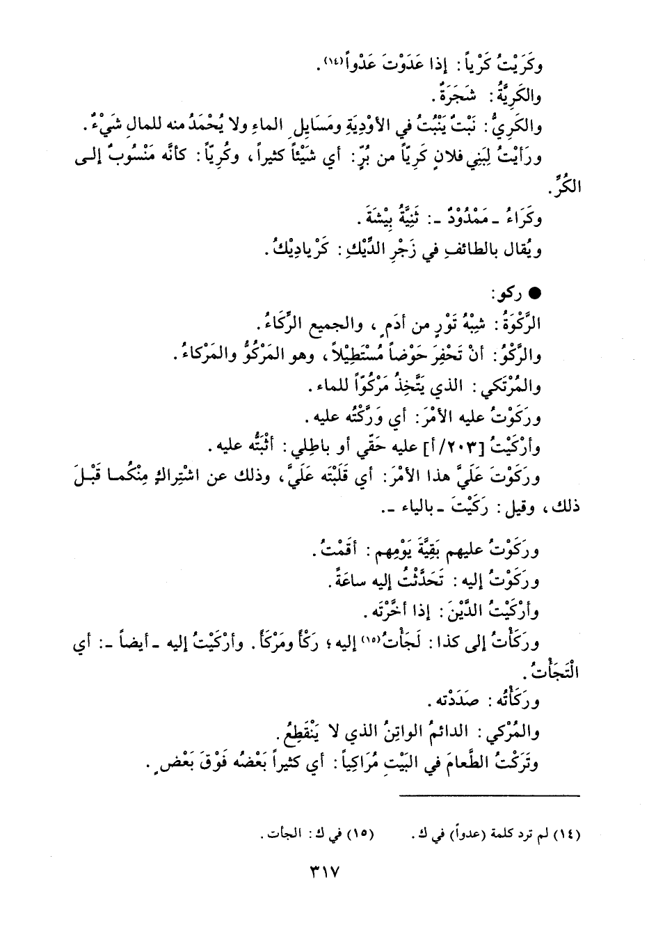 وكَرَيْتُ كَرياً : إذا عَدَوْتَ عَدْواً . والكَرِيَّةُ : شَجَرَةٌ . والكَرِيُّ : نَبْتٌ يَنْبُتُ في الأوْدِيَةِ ومَسَايِل الماءٍ ولا يُحْمَدُ منه للمالِ شَيْءٌ . ورَأيْتُ لِبَنِي فلانٍ كَرِيّاً من بُرٍّ : أي شَيْئاً كثيراً ، وكُرِيّاً : كأنَّه مَنْسُوبٌ إلى الكُرِّ . وكَرَاءُ - مَمْدُوْدٌ - : ثَنِيِّةُ بِيْشَةَ . ويُقال بالطائفِ في زَجْرِ الدِّيْكِ : كَرْيادِيْكُ . ركو الرَّكْوَةُ : شِبْهُ تَوْرٍ من أدَم ، والجميع الرِّكَاءُ . والرَّكْوُ : أنْ تَحْفِرَ حَوْضاً مُسْتَطِيْلاً ، وهو المَرْكُوُ والمَرْكاءُ . والمُرْتَكي : الذي يَتَّخِذُ مَرْكُوّاً للماء . ورَكَوْتُ عليه الأمْرَ : أي وَرَّكْتُه عليه . وأرْكَيْتُ عليه حَقّي أو باطِلي : أثْبَته عليه . ورَكَوْتَ عَلَيَّ هذا الأمْرَ : أي قَلَبْتَه عَلَيَّ ، وذلك عن اشْتِراكٍ مِنْكُما قَبْلَ ذلك ، وقيل : رَكَيْتَ - بالياء - . ورَكَوْتُ عليهم بَقِيَّةَ يَوْمِهم أقَمْتُ . ورَكَوْتُ إليه : تَحَدَّثْتُ إليه ساعَةً . وأرْكَيْتُ الدَّيْنَ : إذا أخَّرْتَه . ورَكَأتُ إلى كذا : لَجَأتُ إليه رَكْأَ ومَرْكَأً . وأرْكَيْتُ إليه - أيضاً - : أي الْتَجَأْتُ . ورَكَأتُه : صَدَدْته . والمُرْكي : الدائمُ الواتِنُ الذي لا يَنْقَطِعُ . وتَرَكْتُ الطَّعامَ في البَيْتِ مُرَاكِياً : أي كثيراً بَعْضُه فَوْقَ بَعْض .