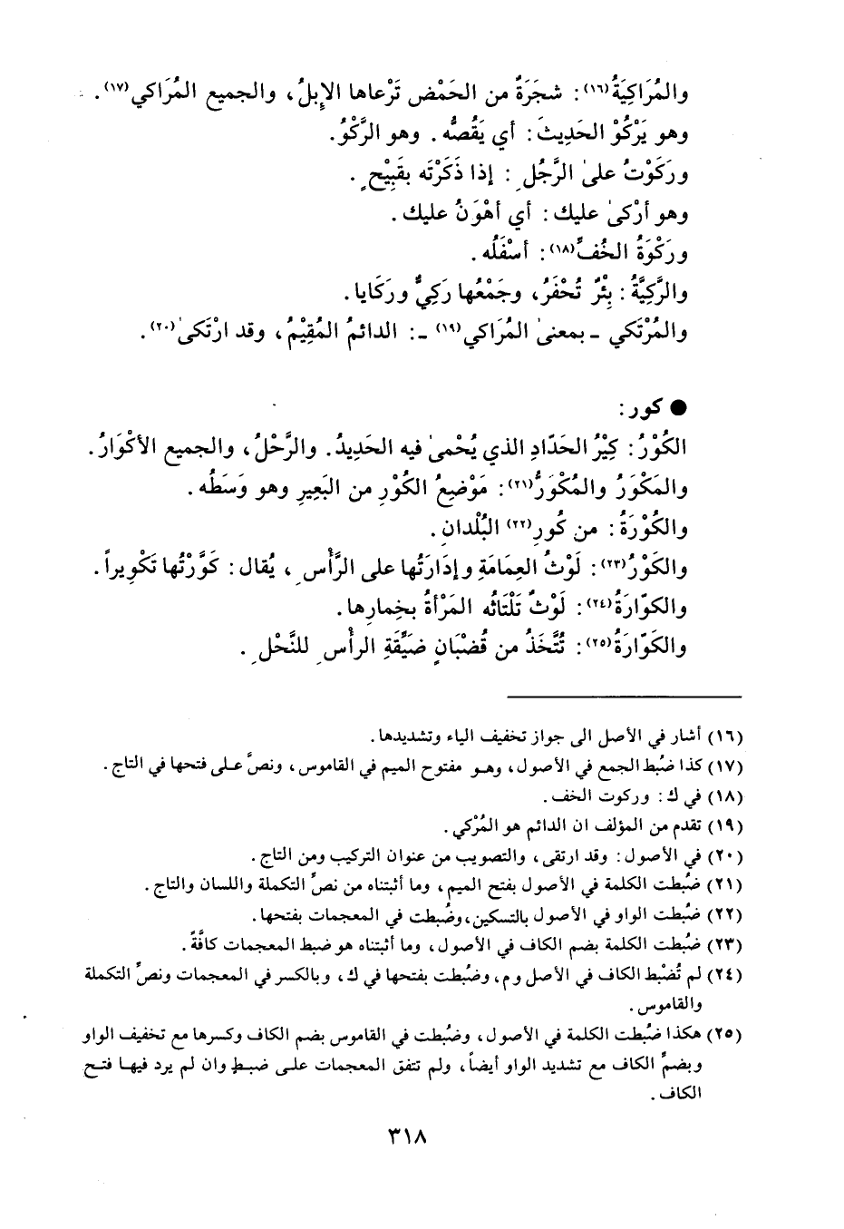 والمُرَاكِيَةُ : شجَرَةٌ من الحَمْض تَرْعاها الإِبلُ ، والجميع المُرَاكي . وهو يَرْكُوْ الحَدِيثَ : أي يَقُصُّه . وهو الرَّكْوُ . ورَكوْتُ على الرجُل : إذا ذَكَرْتَه بقَبِيْحٍ . وهو أرْكى عليك : أي أهْوَنُ عليك . ورَكْوَةُ الخُفِّ : أسْفَلُه . والرَّكِيَّةُ : بِئْرٌ تُحْفَرُ ، وجَمْعُها رَكِيٌ ورَكَايا . والمُرْتَكي - بمعنى المُرَاكي - : الدائمُ المُقِيْمُ ، وقد ارْتَكى . كور الكُوْرُ : كِيْرُ الحَدّادِ الذي يُحْمى فيه الحَدِيدُ . والرَّحْلُ ، والجميع الأكْوَارُ . والمَكْوَرُ والمُكْورُّ : مَوْضِعُ الكُوْرِ من البَعِيرِ وهو وَسَطُه . والكُوْرَةُ : من كُورِ البُلْدانِ . والكَوْرُ : لَوْثُ العِمَامَةِ وإدَارَتُها على الرَّأْس ، يُقال : كَوَّرْتُها تَكْوِيراً . والكوّارَةُ : لَوْثٌ تَلْتَاثُه المَرْأةُ بخِمارِها . والكَوّارَةُ : تُتَخَذُ من قُضْبَانٍ ضَيقَةِ الرأْس للنَّحْلِ .