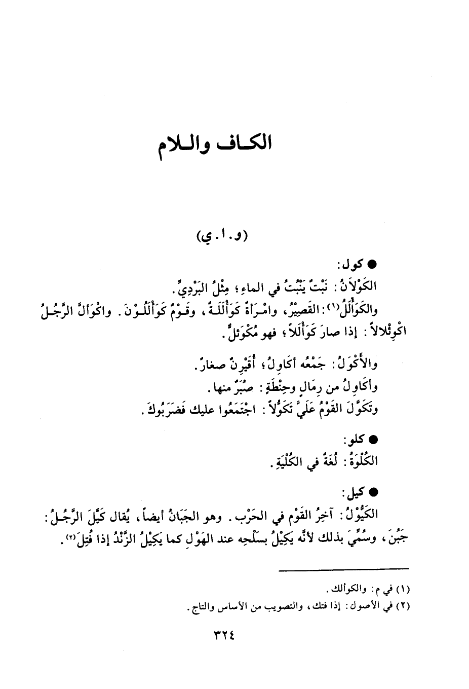 كول الكَوْلاَنُ : نَبْتٌ يَنْبُتُ في الماءِ مِثْلُ البَرْدِيِّ . والكَوألَلُ : القَصِيْرُ ، وامْرَأةٌ كَؤَالَلَةٌ ، وقَوْمٌ كَوألَلُوْنَ . واكْوَألَّ الرَّجُلُ اكْوئْلالاً . إذا صارَ كَوألَلاً فهو مُكْوَئلٌّ . والأكْوَلُ : جَمْعُه أكَاوِلُ أُقَيْرِنٌ صغارٌ . وأكَاوِلُ من رِمَالٍ وحِنْطَةٍ : صُبَرٌ منها . وتَكَوَّلَ القَوْمُ عَلَيَ تَكَوُّلاً : اجْتَمَعُوا عليك فَضَرَبُوكَ . كلو الكُلْوَةُ : لُغَةٌ في الكُلْيَةِ . كيل الكَيُّوْلُ : آخِرُ القَوْم في الحَرْب . وهو الجَبَانُ أيضاً ، يُقال كَيَّلَ الرجُلُ : جَبُنَ ، وسُمِّيَ بذلك لأنَّه يَكِيْلُ بسَلْحِه عند الهَوْلِ كما يَكِيْلُ الزَّنْدُ إذا فُتِلَ .
