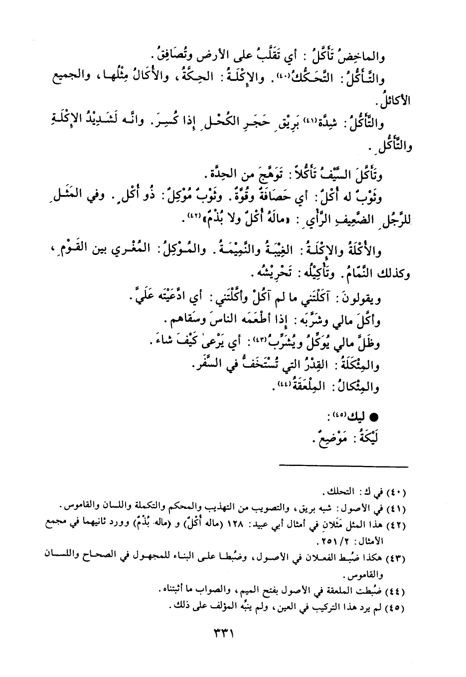 والماخِضُ تَأكَلُ : أي تَقَلَّبُ على الأرض وتُصَافِقُ . والتَأكُّلُ : التَّحَكُكُ . والإِكْلَةُ : الحِكةُ ، والأُكَالُ مِثْلُها ، والجميع الأُكائلُ . والتَّأَكُّلُ : شدَّة بَرِيْق حَجَرِ الكُحْل إِذا كُسِرَ . وانَّه لَشَدِيْدُ الإِكْلَةِ والتّأَكُلَ . وتَأكلَ السَّيْفُ تَأكلاً : تَوَهَّجِ من الحدَّة . وثَوْبٌ له أُكْلٌ : أي حَصَافة وقُوَّةٌ . وثَوْبٌ مُوْكِلٌ : ذُو أُكْلٍ . وفي المَثَل للرَّجُل الضَّعِيفِ الرَّأْي : ' مالَهُ أُكْلٌ ولا بُذْمٌ ' . والأُكْلَة والإكْلَةُ : الغِيْبَةُ والنَّمِيْمَةُ . والمُوْكِلُ : المُغْري بين القَوْم ، وكذلك النَّمّامُ . وتَأْكِيْلُه : تَحْرِيْشُه . ويقولونَ : آكَلْتَني ما لم آكُلْ وأكَّلْتَني : أي ادَّعَيْتَه عَلَيَّ . وأكَّلَ مالي وشَرَّبَه : إِذا أطْعَمَه الناسَ وسَقاهم . وظَلَّ مالي يُوَكِّلُ ويُشَربُ : أي يَرْعى كَيْفَ شاءَ . والمِئْكَلَةُ : القِدْرُ التي تُسْتَخَفُّ في السَّفَر . والمِئْكالُ : المِلْعَقَةُ . ليك لَيْكَةُ : مَوْضِعٌ .