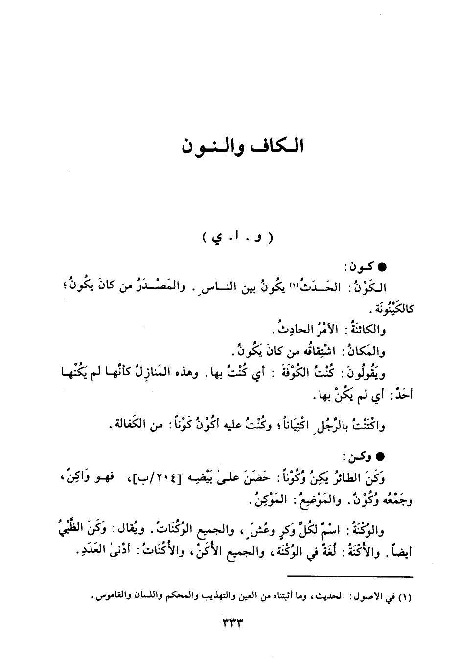 كون الكَوْنُ : الحَدَثُ يكُونُ بين الناس . والمَصْدَرُ من كانَ يكُونُ كالكَيْنُونَة . والكائنَةُ : الأمْرُ الحادِثُ . والمَكانُ : اشْتِقاقُه من كانَ يَكُونُ . ويَقُولُونَ : كُنْتُ الكُوْفَةَ : أي كُنْتُ بها . وهذه المَنازِلُ كأنَها لم يَكُنْها أحَدٌ : أي لم يَكُنْ بها . واكْتَنْتُ بالرَّجُل اكْتِيَاناً وكنْتُ عليه أكُوْنُ كَوْناً : من الكَفالة . وكن وَكَنَ الطائرُ يَكِنُ وُكُوْناً : حَضَنَ على بَيْضِه فهو وَاكِن ، وجَمْعُه وُكُوْنٌ . والمَوْضِعُ : المَوْكِنُ . والوُكْنَةُ : اسْمٌ لكُل وَكرٍ وعُشٍّ ، والجميع الوُكُنَاتُ . ويُقال : وَكَنَ الظَّبْيُ أيضاً . والأُكْنَةُ : لُغَةٌ في الوُكْنَة ، والجميع الأكَنُ ، والأُكُنَاتُ : أدْنى العَدَدِ .