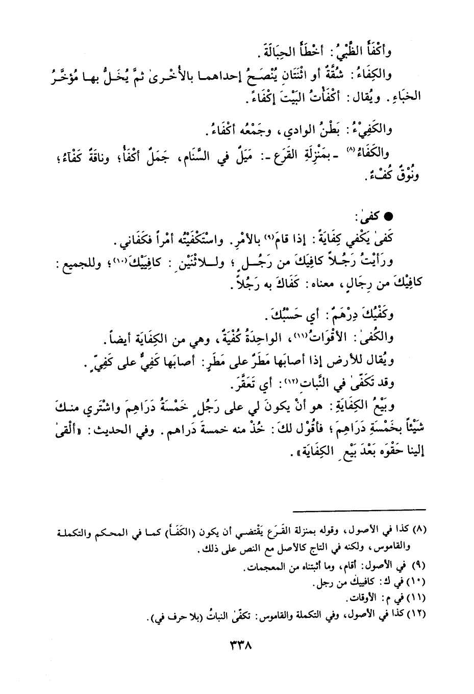 وأكْفَأ الظَّبْيُ : أخْطَأ الحِبَالَةَ . والكِفَاءُ : شُقَّةٌ أو اثْنَتَانِ يُنْصَحُ إحداهما بالأُخْرى ثمَّ يُخَلُّ بها مُؤخَّرُ الخبَاءِ . ويُقال : أكْفَأتُ البَيْتَ إكْفَاءً . والكَفِيْءُ : بَطْنُ الوادي ، وجَمْعُه أكْفَاءُ . والكَفَاءُ - بمَنْزِلَةِ القَرَع - : مَيَلٌ في السَّنَام ، جَمَلٌ أكْفَأُ وناقَةٌ كَفْآءُ ونُوْقٌ كُفْءٌ . كفى كَفى يَكْفي كِفَايَةً : إذا قامَ بالأمْرِ . واسْتَكْفَيْتُه أمْراً فكَفَاني . ورَأيْتُ رَجُلاً كافِيَكَ من رَجُلٍ وللاثْنَيْن : كافِيَيْكَ وللجميع : كافِيْكَ من رِجَالٍ ، معناه : كَفَاكَ به رَجُلاً . وكَفْيُكَ دِرْهَمٌ : أي حَسْبُكَ . والكُفى : الأقْوَاتُ ، الواحِدَةُ كفْيَةٌ ، وهي من الكِفَايَة أيضاً . ويُقال للأرض إذا أصابَها مَطَرٌ على مَطَرٍ : أصابَها كَفِيٌّ على كَفِيٍّ . وقد تَكَفّى في النَباتِ : أي تَعَقَرَ . وبَيْعُ الكِفَايَةِ : هو أنْ يكونَ لي على رَجُل خَمْسَةُ دَرَاهِمَ واشْتَري منكَ شيئاً بخَمْسَةِ دَرَاهِمَ فأقُوْل لكَ : خُذْ منه خمسةَ دَراهم . وفي الحديث : ' ألْقى إلينا حَقْوَه بَعْدَ بَيْع الكِفَايَة ' .