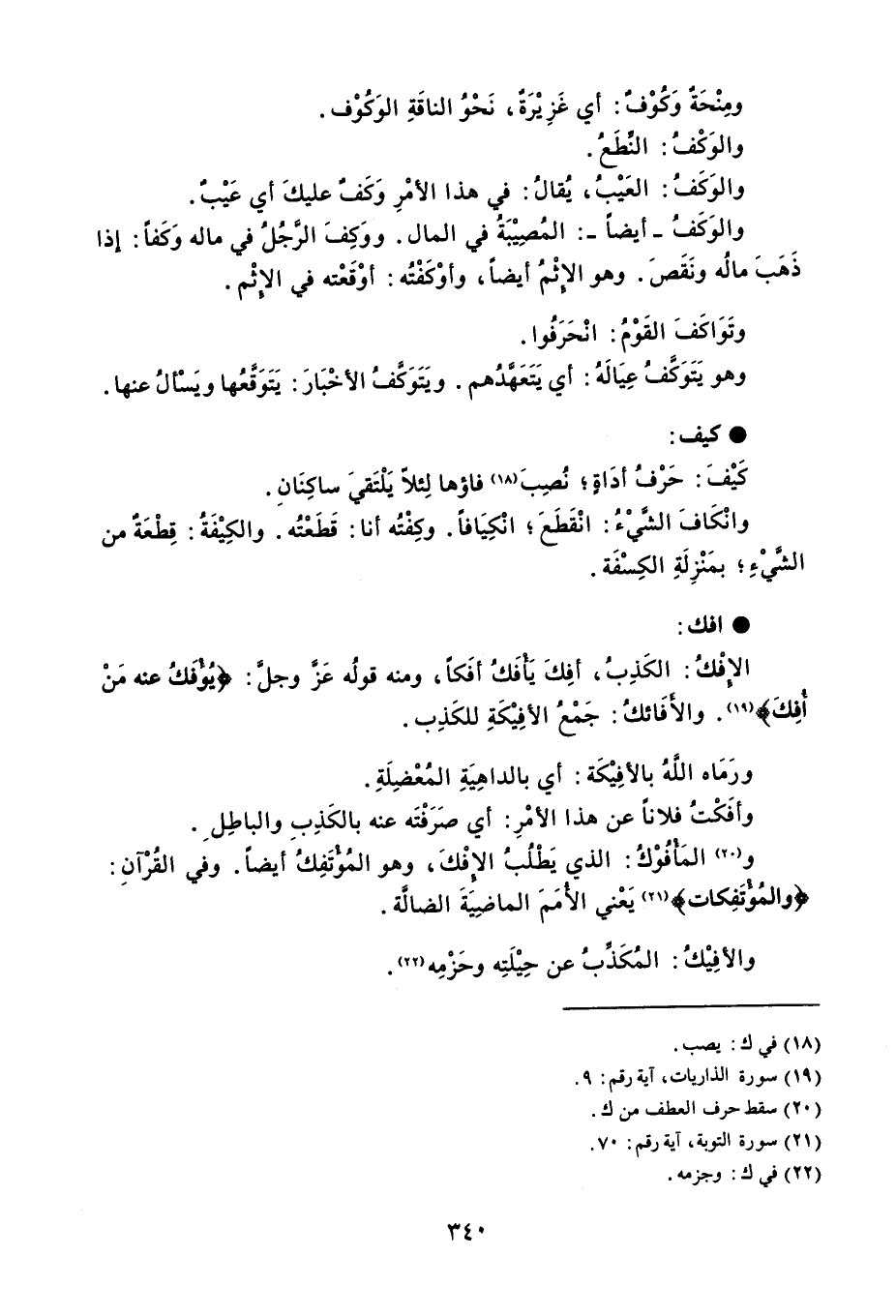 ومِنْحَةٌ وَكُوْفٌ : أي غَزِيْرَةٌ ، نَحْوُ الناقَةِ الوَكُوْف . والوَكْفُ : النِّطَعُ . والوَكَفُ : العَيْبُ ، يُقالُ : في هذا الأمْرِ وَكَفٌ عليكَ أي عَيْبٌ . والوَكَفُ - أيضاً - : المُصِيْبَةُ في المال . ووَكِفَ الرَّجُلُ في ماله وَكَفاً : إذا ذهَبَ مالُه ونَقَصَ . وهو الإثْمُ أيضاً ، وأوْكَفْتُه : أوْقَعْته في الإثْم . وتَوَاكَفَ القَوْمُ : انْحَرَفُوا . وهو يَتَوَكَفُ عِيَالَهُ : أي يَتَعَهَّدُهم . ويَتَوَكَفُ الأخْبَارَ : يَتَوَقَعُها ويَسْألُ عنها . كيف كَيْفَ : حَرْفُ أدَاةٍ نُصِبَ فاؤها لِئلاّ يَلْتَقيَ ساكِنَانِ . وانْكَافَ الشَّيْءُ : انْقَطَعَ ، انْكِيَافاً . وكِفْتُه أنا : قَطَعْتُه . والكِيْفَةُ : قِطْعَة من الشَّيءِ بمَنْزِلَةِ الكِسْفَة . ؟ ؟ افك الإفْكُ : الكَذِبُ ، أفِكَ يَأفَكُ أفَكاً ، ومنه قولُه عَزَّ وجلَّ : ' يُؤفَكُ عنه مَنْ أُفِكَ ' . والأفَائكُ : جَمْعُ الأفِيْكَةِ للكَذِب . ورَمَاه اللَّهُ بالأفِيْكَة : أي بالداهِيَةِ المُعْضِلَةِ . وأفَكْتُ فلاناً عن هذا الأمْرِ : أي صَرَفْتَه عنه بالكَذِبِ والباطِل . والمَأفُوْكُ : الذي يَطْلُبُ الإِفْكَ ، وهو المُؤْتَفِكُ أيضاً . وفي القُرْآنِ : ' والمُؤتَفِكات ' يَعْني الأُمَمَ الماضِيَةَ الضالَّة . والأفِيْك : المُكَذِّبُ عن حِيْلَتِه وحَزْمِه .