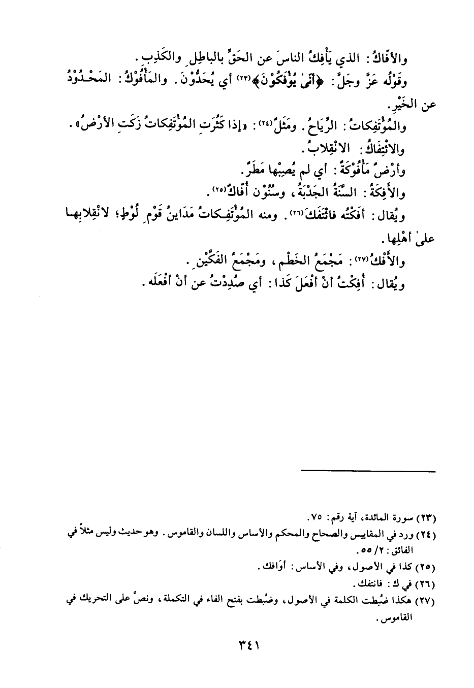 والأفّاكُ : الذي يَأْفِكُ الناسَ عن الحَقِّ بالباطِل والكَذِبِ . وقَوْلُه عَزَّ وجَلَّ : ' أنّى يُؤْفَكُوْنَ ' أي يُحَدُّوْنَ . والمَأفُوْكُ : المَحْدُوْدُ عن الخَيْرِ . والمُؤتَفِكاتُ : الريَاحُ . ومَثَل : ' إذا كَثُرَتِ المُؤتَفِكاتُ زَكَتِ الآرْضُ ' . والائْتِفَاكُ : الانْقِلابُ . وأرْضٌ مَأْفُوْكَةُ : أي لم يُصِبْها مَطَرٌ . والأفِكَةُ : السَّنَةُ الجَدْبَةُ ، وسُنُوْن أُفّاكٌ . ويُقال : أفَكْتُه فائْتَفَكَ . ومنه المؤْتَفِكاتُ مَدَاينُ قَوْم لُوْطٍ لانْقِلابِها على أهْلِها . والأفْكُ : مَجْمَعُ الخَطْم ، ومَجْمَعُ الفكَيْنِ . ويُقال : أُفِكْتُ أنْ أفْعَلَ كَذا : أي صُدِدْتُ عن أنْ أفْعَلَه .