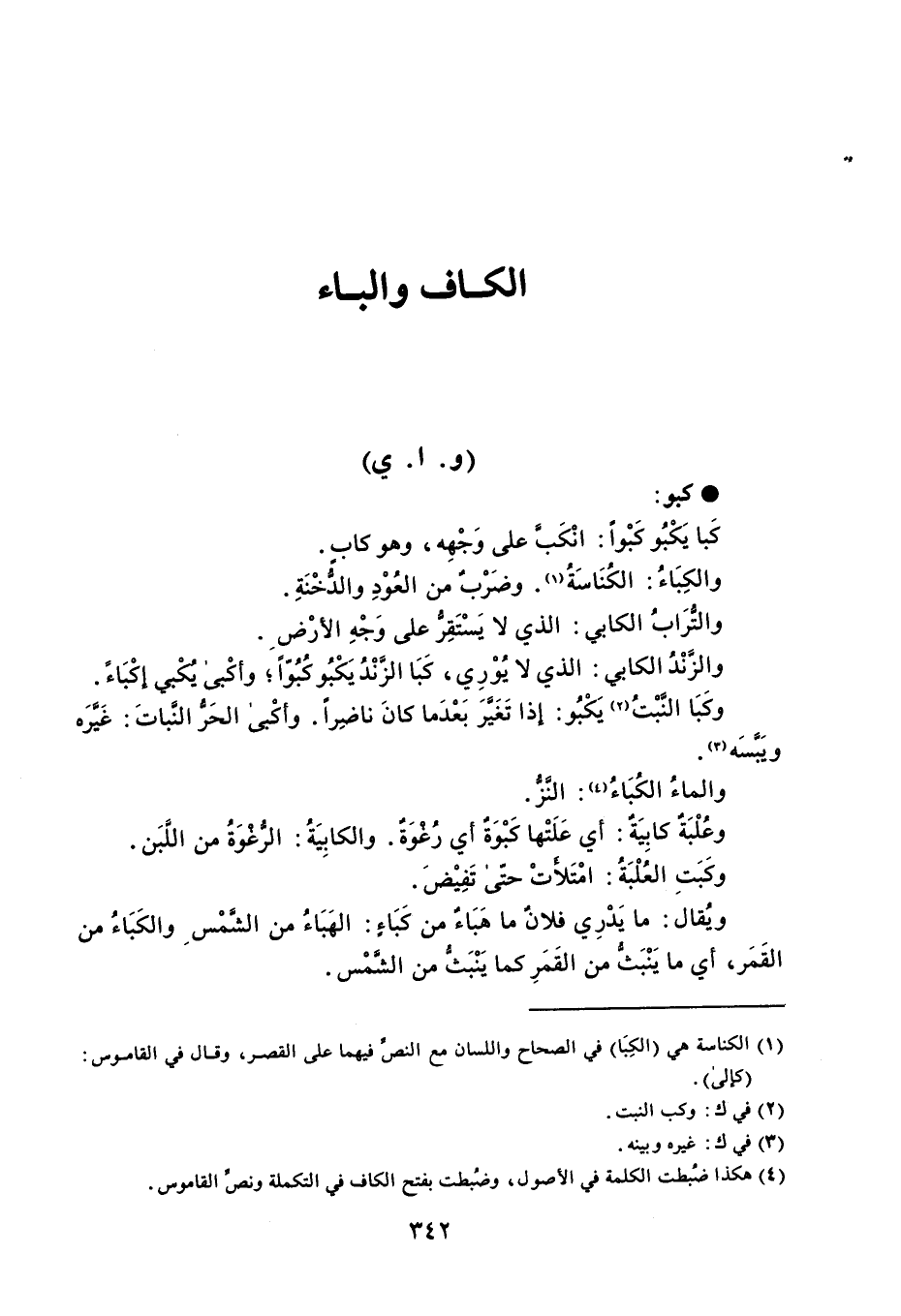 كبو كَبا يَكْبُو كَبْواً : انْكَبَّ على وَجْهِه ، وهو كابٍ . والكِبَاءُ : الكُنَاسَةُ . وضَرْبٌ من العُوْدِ والدُّخْنَةِ . والتُّرَابُ الكابي : الذي لا يَسْتَقِر على وَجْهِ الأرْض . والزَّنْدُ الكابي : الذي لا يُوْرِي ، كَبَا الزَّنْدُ يَكْبُو كُبُوّاً ، وأكْبى يُكْبي إكْبَاءَ . وكَبَا النَبْتُ ' يَكْبُو : إذا تَغَيَّرَ بَعْدَما كانَ ناضِراً . وأكْبى الحَر النَباتَ : غَيرَه ويَبَّسَه . والماءُ الكُبَاءُ : النَّزُّ . وعُلْبَةٌ كابِيَةٌ : أي عَلَتْها كَبْوَةٌ أي رُغْوَةٌ . والكابِيَةُ : الرُّغوَةُ من اللَّبَن . وكَبَتِ العُلْبَةُ : امْتَلأتْ حتّى تَفِيْضَ . ويُقال : ما يَدْرِي فلانٌ ما هَبَاءٌ من كَبَاءٍ : الهَبَاءُ من الشَّمْس والكَبَاءُ من القَمَر ، أي ما يَنْبَثُّ من القَمَرِ كما يَنْبَثُّ من الشَّمْس .