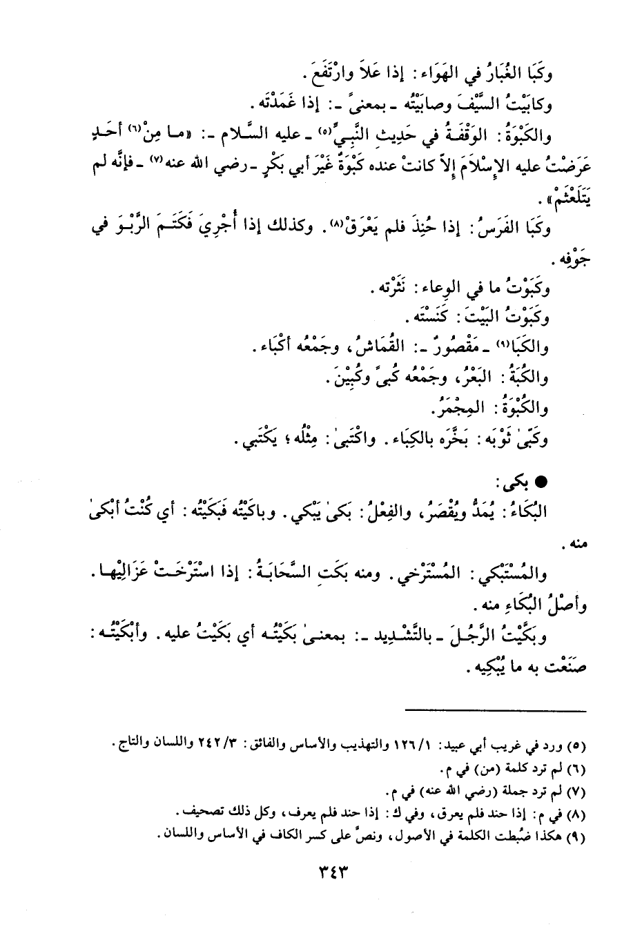 وكَبَا الغُبَارُ في الهَوَاء : إذا عَلاَ وارْتَفَعَ . وكابَيْتُ السَّيْفَ وصابَيْتُه - بمعنىً - : إذا غَمَدْتَه . والكَبْوَةُ : الوَقْفَةُ في حَدِيثِ النَّبِيَ - عليه السَّلام - : ' ما مِنْ أحَدٍ عَرَضْتُ عليه الإِسْلاَمَ إِلاّ كانتْ عنده كَبْوَةٌ غَيْرَ أبي بَكْرٍ - رضي الله عنه - فإنَّه لم يَتَلَعْثَمْ ' . وكَبَا الفَرَسُ : إذا حُنِذَ فلم يَعْرَقْ . وكذلك إذا أُجْرِيَ فَكَتَمَ الرَّبْوَ في جوفه . وكَبَوْتُ ما في الوِعاء : نَثَرْته . وكَبَوْتُ البَيْتَ : كَنَسْتَه . والكَبَا - مَقْصُورٌ - : القُمَاشُ ، وجَمْعُه أكْبَاء . والكُبَةُ : البَعْرُ ، وجَمْعُه كُبىً وكُبِيْنَ . والكُبْوَةُ : المِجْمَرُ . وكَبّى ثَوْبَه : بَخَّرَه بالكِبَاء . واكْتَبى : مِثْلُه يَكْتَبي . بكى البُكَاءُ : يُمَدُّ ويُقْصَرُ ، والفِعْلُ : بَكى يَبْكي . وباكَيْتُه فَبَكَيْتُه : أي كُنْتُ أبْكى منه . والمُسْتَبْكي : المُسْتَرْخي . ومنه بَكَتِ السَّحَابَةُ : إذا اسْتَرْخَتْ عَزَالِيْها . وأصْلُ البكَاءِ منه . وبَكَّيْتُ الرَّجُلَ - بالتَّشْدِيد - : بمعنى بَكَيْتُه أي بَكَيْتُ عليه . وأبْكَيْتُه : صَنَعْت به ما يُبْكِيه .