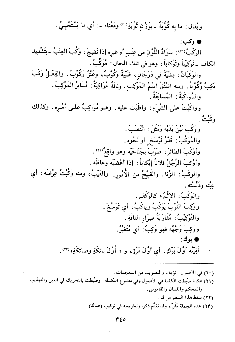 ويُقال : ما بِه كُؤَبَةٌ - بوَزْنِ تُؤَبَةٍ ومَعْناه - : أي ما يَسْتَحْيِيْ . وكب الوَكْبُ : سَوَادُ اللَّوْنِ من عِنَبٍ أو غيرِه إذا نَضِجَ ، وَكَبَ العِنَبُ - بتَشْدِيد الكاف - تَوْكِيْباً وتَوْكاباً ، وهو في تلك الحال : مُوَكِّبٌ . والوَكَبَانُ : مِشْيَةٌ في دَرَجَانٍ ، ظَبْيَةٌ وَكُوْبٌ ، وعَنْزٌ وَكُوْبٌ . والفِعْلُ وَكَبَ يَكِبُ وُكُوْباً . ومنه اشْتُقَّ اسْمُ المَوْكِبِ . وناقَةٌ مُوَاكِبَةٌ : تُسَايِرُ المَوْكِبَ . والمُوَاكَبَةُ : المُسَابَقَةُ . وواكَبْتُ على الشَّيْءِ : واظَبْت عليه . وهو مُوَاكِبُ على أمْرِه . وكذلك وَكَبْتُ . ووَكَبَ بَيْنَ يَدَيْه وَمَثَلَ : انْتَصَبَ . والمُوَكِّبُ : قَدْرُ فَرْسَخ أو نَحْوه . وأوْكَبَ الطائر : ضَرَبَ بجَنَاحَيْه وهو واقِعٌ . وأوْكَبَ الرَّجُلُ فلاناً إيْكاباً : إذا أغْضَبَه وغاظَه . والوَكَبُ : الزِّنا . والقَبِيْحُ من الأُمُورِ . والعَيْبُ ، ومنه وَكَّبْتُ عِرْضَه : أي عِبْته ودَنَّسْته . والوَكَبُ : الإِثْمُ كالوَكَفِ . ووَكِبَ الثَّوْبُ يوْكَبُ وياكَبُ : أي تَوَسَّخَ . والتَّوْكِيْبُ : مُقَارَبَةُ صِرَارِ الناقَةِ . ووَكِبَ وَجْهُه فهو وَكِبٌ : أي مُتَغَيِّرٌ . بوك لَقِيْتُه أوَّلَ بَوْكٍ : أي أوَّلَ مَرَّةٍ ، و ' أَوَّلَ بائكَةٍ وصائكَةٍ ' .