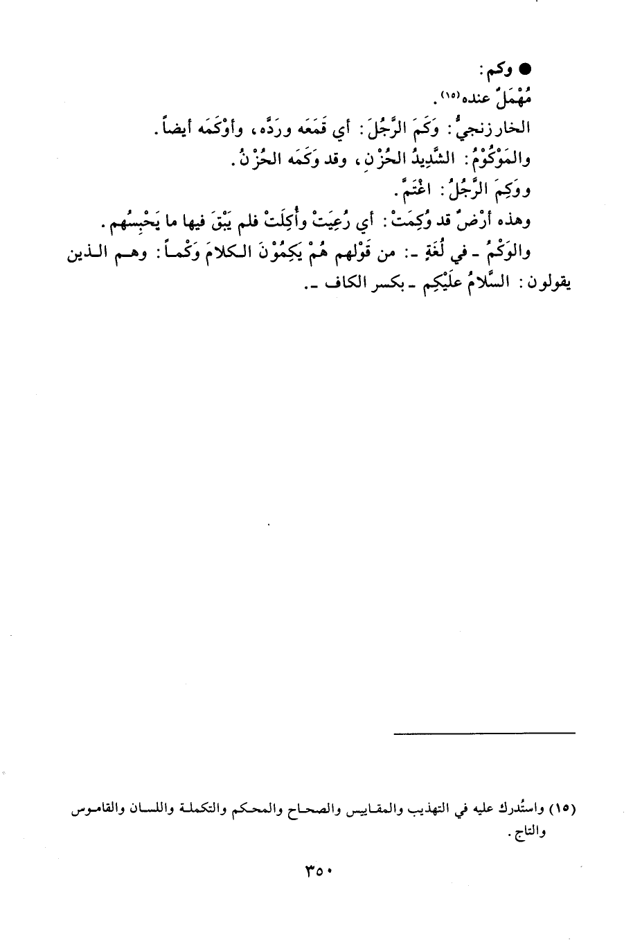 وكم مُهْمَلٌ عنده . الخارزنجيُّ : وَكَمَ الرجُلَ : أي قَمَعَه ورَدَّه ، وأوْكَمَه أيضاً . والمَوْكُوْمُ : الشَّدِيدُ الحُزْنِ ، وقد وَكَمَه الحُزْنُ . ووَكِمَ الرَجُلُ : اغْتَمَّ . وهذه أرْضٌ قد وُكِمَتْ : أي رُعِيَتْ وأُكِلَتْ فلم يَبْقَ فيها ما يَحْبِسُهم . والوَكْمُ - في لُغَةٍ - : من قَوْلهم هُمْ يَكِمُوْنَ الكلامَ وَكْماً : وهم الذين يقولون : السَّلامُ علَيْكِم - بكسر الكاف - .