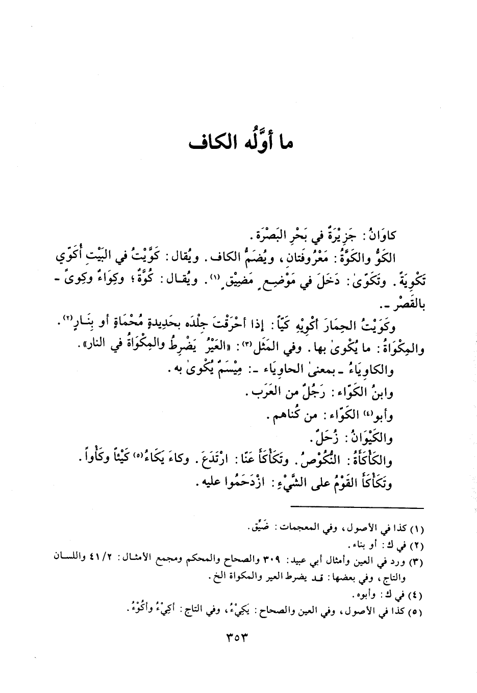 كاوَانُ : جَزِيْرَةٌ في بَحْرِ البَصْرَة . الكَو والكَوَّةُ : مَعْرُوفَتانِ ، ويُضَمُّ الكاف . ويُقال : كَوَّيْتُ في البَيْتِ أُكَوّي تَكْوِيَةً . وتَكَوّى : دَخَلَ في مَوْضِع مَضِيْق . ويُقال : كُوَّةٌ وكِوَاءٌ وكِوىً - بالقَصْر - . وكَوَيْتُ الحِمَارَ أكْويهِ كَيّاً : إذا أحْرَقْتَ جِلْدَه بحَدِيدةٍ مُحْمَاةٍ أو بِنَارٍ . والمِكْوَاةُ : ما يُكْوى بها . وفي المَثَل : ' العَيْرُ يَضرِطُ والمِكْوَاة في النار ' . والكاوِيَاءُ - بمعنى الحاوِيَاء - : مِيْسَمٌ يُكوى به . وابنُ الكَوّاء : رَجُلٌ من العَرَب . وأبو الكَوّاء : من كُناهم . والكَيْوَانُ : زُحَلٌ . والكَأكَأةُ : النكوْصُ . وتَكَاكَأَ عَنّا : ارْتَدَعَ . وكاءَ يَكَاءُ كَيْئاً وكَأْواً . وتَكَأْكَأ القَوْمُ على الشَّيْءِ : ازْدَحَمُوا عليه .