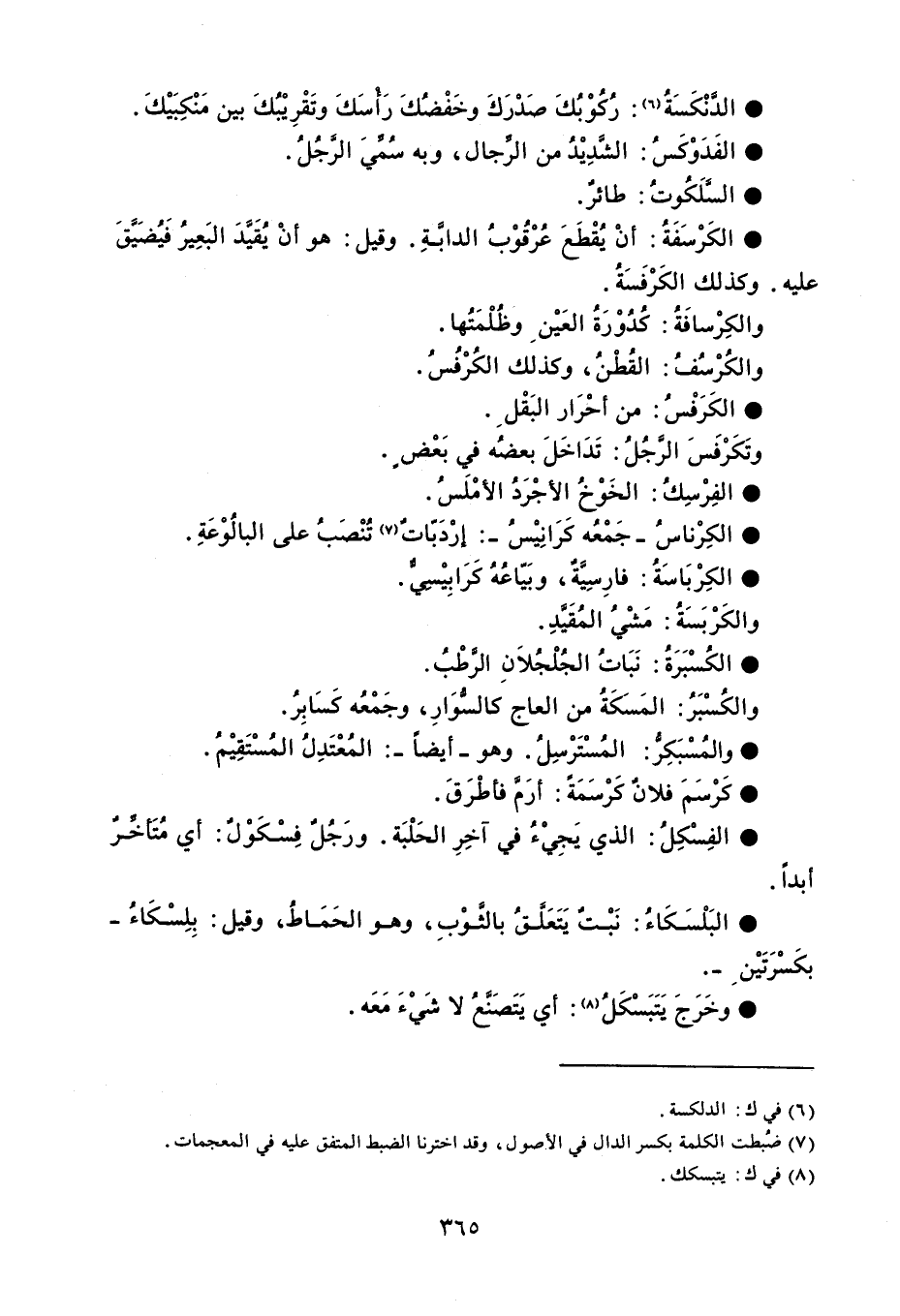 الدَّنْكَسَةُ رُكُوْبُكَ صدْرَكَ وخَفْضُكَ رَأْسَكَ وتَقْرِيْبُكَ بين مَنْكِبَيْكَ . الفَدَوْكَسُ الشَّدِيْدُ من الرجال ، وبه سُمِّيَ الرَّجُلُ . السَّلَكُوتُ طائرٌ . الكَرْسَفَةُ أنْ يُقْطَعَ عُرْقُوْبُ الدابَّةِ . وقيل هو أنْ يُقَيدَ البَعِيرُ فَيُضَيق عليه . وكذلك الكَرْفَسَةُ . والكِرْسافَةُ كُدُوْرَةُ العَيْن وظُلْمَتُها . والكُرْسُفُ القُطْنُ ، وكذلك الكُرْفُسُ . الكَرَفْسُ من أحْرَار البَقْل . وتَكَرْفَسَ الرَّجُلُ تَدَاخَلَ بعضُه في بَعْض . الفِرْسِكُ الخَوْخُ الأجْرَدُ الأمْلَسُ . الكِرْناسُ - جَمْعُه كَرَانِيْسُ - إرْدَبّاتٌ تُنْصَبُ على البالُوْعَةِ . الكِرْبَاسَةُ فارِسِيَّةٌ ، وبَيّاعُهُ كَرَابِيْسِيٌّ . والكَرْبَسَةُ مَشْيُ المُقَيَّدِ . الكُسْبَرَةُ نَبَاتُ الجُلْجُلاَنِ الرطْبُ . والكُسْبَرُ المَسَكَةُ من العاج كالسَّوَارِ ، وجَمْعُه كَسَابِرُ . والمُسْبَكِر المُسْتَرْسِلُ . وهو - أيضاً - المُعْتَدِلُ المُسْتَقِيْمُ . كَرْسَمَ فلان كَرْسَمَةً أرَمَّ فأطْرَقَ . الفِسْكِلُ الذي يَجِيْءُ في آخِرِ الحَلْبَة . ورَجُل فِسْكَوْلٌ أي مُتَأخرٌ أبداً . البَلْسَكَاءُ نَبْتٌ يَتَعَلَّقُ بالثَّوْبِ ، وهو الحَمَاطُ ، وقيل بِلِسْكَاءُ - بكَسْرَتَيْن - . وخَرَجَ يَتَبَسْكَلُ أي يَتَصَنَّعُ لا شَيْءَ مَعَه .