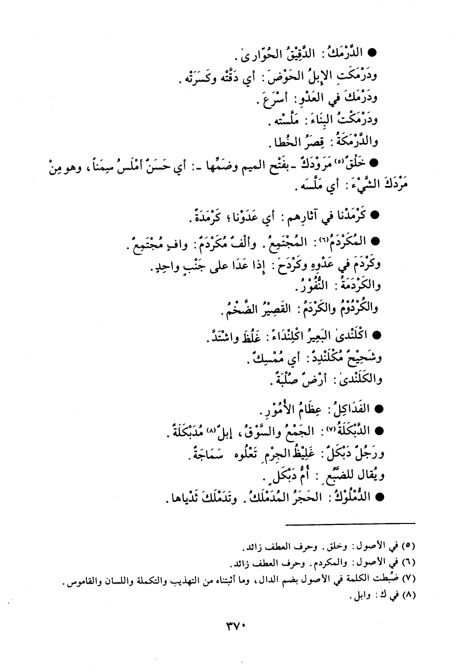 الدَّرْمَكُ الدَّقِيْقُ الحُوّارى . ودَرْمَكَتِ الإِبل الحَوْضَ أي دَقَّتْه وكَسَرَتْه . ودَرْمَكَ في العَدْوِ : أسْرَعَ . ودَوْمَكْتُ البِنَاءَ : ملَّسْته . والدَّرْمَكَةُ : قِصَر الخُطا . خَلْقٌ مَرَوْدَكٌ - بفَتْح الميم وضَمِّها - أي حَسَنٌ أمْلَسُ سِمَناً ، وهو مِنْ مَرْدَكَ الشَّيْءَ أي مَلَّسَه . كَرْمَدْنا في آثارِهم أي عَدَوْنا كَرْمَدَةً . المُكَرْدَمُ المُجْتَمِعُ . وألْفٌ مُكَرْدَمٌ وافٍ مُجْتَمِعٌ . وكَرْدَمَ في عَدْوِهِ وكَرْدَحَ إِذا عَدَا على جَنْبٍ واحِدٍ . والكَرْدَمَةُ النُفُوْرُ . والكُرْدُوْمُ والكَرْدَمُ القَصِيْرُ الضَخْمُ . اكْلَنْدى البَعِيرُ اكْلِنْدَاءً غَلُظَ واشْتَدَّ . وشحِيْحٌ مُكْلَنْدِدٌ أي مُمْسِكٌ . والكَلَنْدى أرْضٌ صُلْبَة . الفَدَاكِلُ عِظَامُ الأُمُوْرِ . الدَّبْكَلَةُ الجَمْعُ والسَّوْقُ ، إبلٌ مُدَبْكَلَة . ورَجُلٌ دَبْكَلٌ غَلِيْطُ الجِرْم تَعْلُوه سَمَاجَةٌ . ويُقال للضَّبُعِ أُم دَبْكَل . الدَّمْلُوْكُ الحَجَرُ المُدَمْلَكُ . وتدَمْلَكَ ثَدْياها .