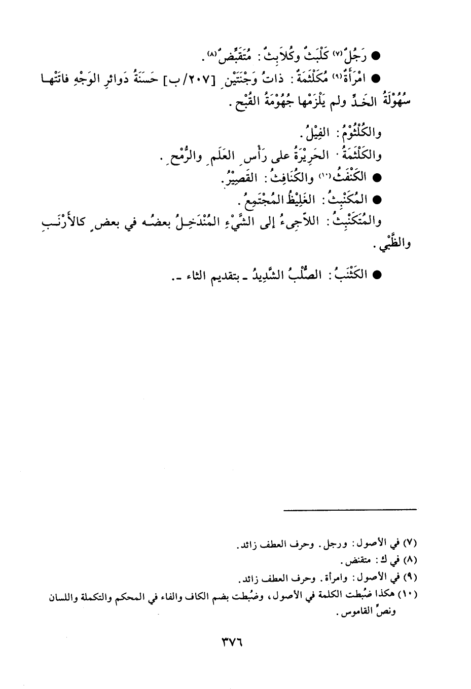 رَجُلٌ كَلْبَثٌ وكُلاَبِثٌ مُتَقَبِّضٌ . امْرَأَةٌ مُكَلْثَمَةٌ ذاتً وَجْنَتَيْن حَسَنَةُ دَوائرِ الوَجْهِ فاتَتْها سهُوْلَةُ الخَدِّ ولم يَلْزَمْها جُهُوْمَةُ القُبْح . والكُلْثُوْمُ الفِيْلُ . والكَلْثَمَةُ . الحَرِيْرَةُ على رَأْس العَلَم والرُّمْح . الكَنْفثُ والكُنَافِثُ القَصِيْرُ . المُكَنْبِثُ الغَلِيْظُ المُجْتَمِعُ . والمُتَكَنْبِثُ اللاّجِىءُ إلى الشَّيْءِ المُنْدَخِلُ بعضُه في بعض كالأَرْنَبِ والظَّبْي . الكَثْنَبُ الصُّلْبُ الشَّدِيدُ - بتقديم الثاء - .