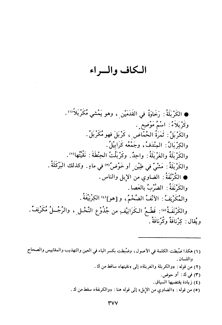 الكَرْبَلَةُ رَخَاوَةٌ في القَدَمَيْن ، وهو يَمْشي مُكَرْبَلاً . وكَرْبَلاَءُ اسْمُ مَوْضِعٍ . والكَرْبَلُ ثَمَرَةُ الحُمّاضِ ، كَرْبَلَ فهو مُكَرْبَلٌ . والكِرْبَالُ المِنْدَفُ ، وجَمْعُه كَرَابِيْلُ . والكَرْبَلَةُ والغَرْبَلَةُ واحِدٌ . وكَرْبَلْتُ الحِنْطَةَ نَقَّيْتُها . والكَرْبَلَةُ : مَشْيٌ في طِيْنٍ أو خَوْضٌ في ماءٍ . وكذلك البَرْكَلَةُ . الكُرْنُفَةُ الضاوي من الإِبل والناس . والكَرْنَفَةُ الضَّرْبُ بالعَصا . والمُكَرْنِفُ الأنْفُ الضَّخْمُ ، وهو الكِرنِيْفَةُ . والكَرْنَفَةُ قَطْعُ الكَرَانِيْفِ من جُذُوْع النَّخْل ، والرَّجُلُ مُكَرْنِفٌ . ويُقال كِرْنافَةٌ وكُرْنافَةٌ .