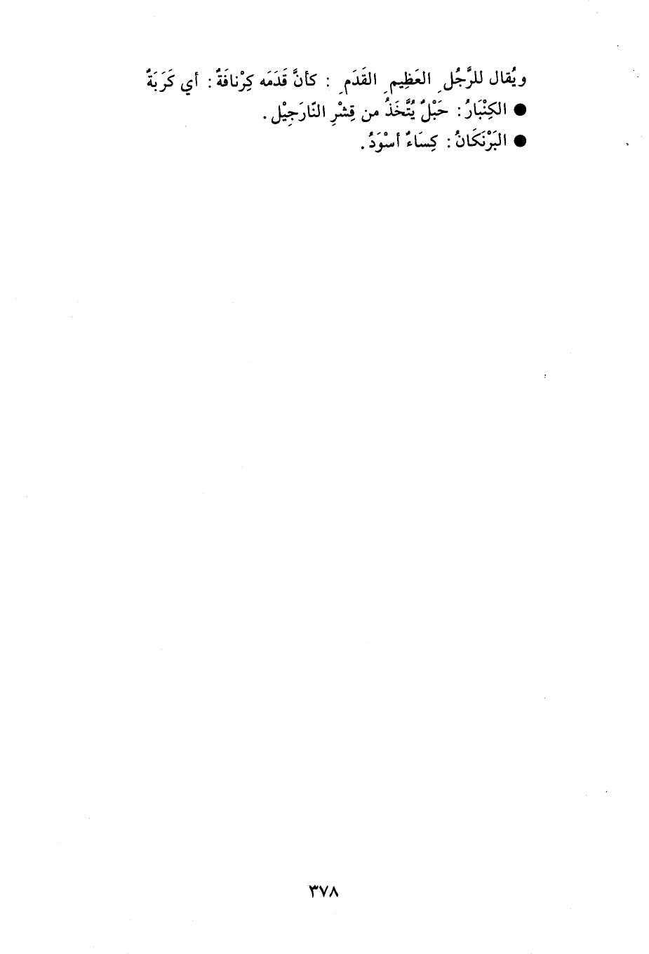 ويُقال للرَّجُل العَظِيم القَدَم كأنَّ قَدَمَه كِرْنافَةٌ أي كَرَبَةٌ . الكِنْبَارُ حَبْلٌ يُتَّخَذُ من قِشْرِ النّارَجِيْل . البَرْنَكَانُ كِسَاءٌ أسْوَدُ .