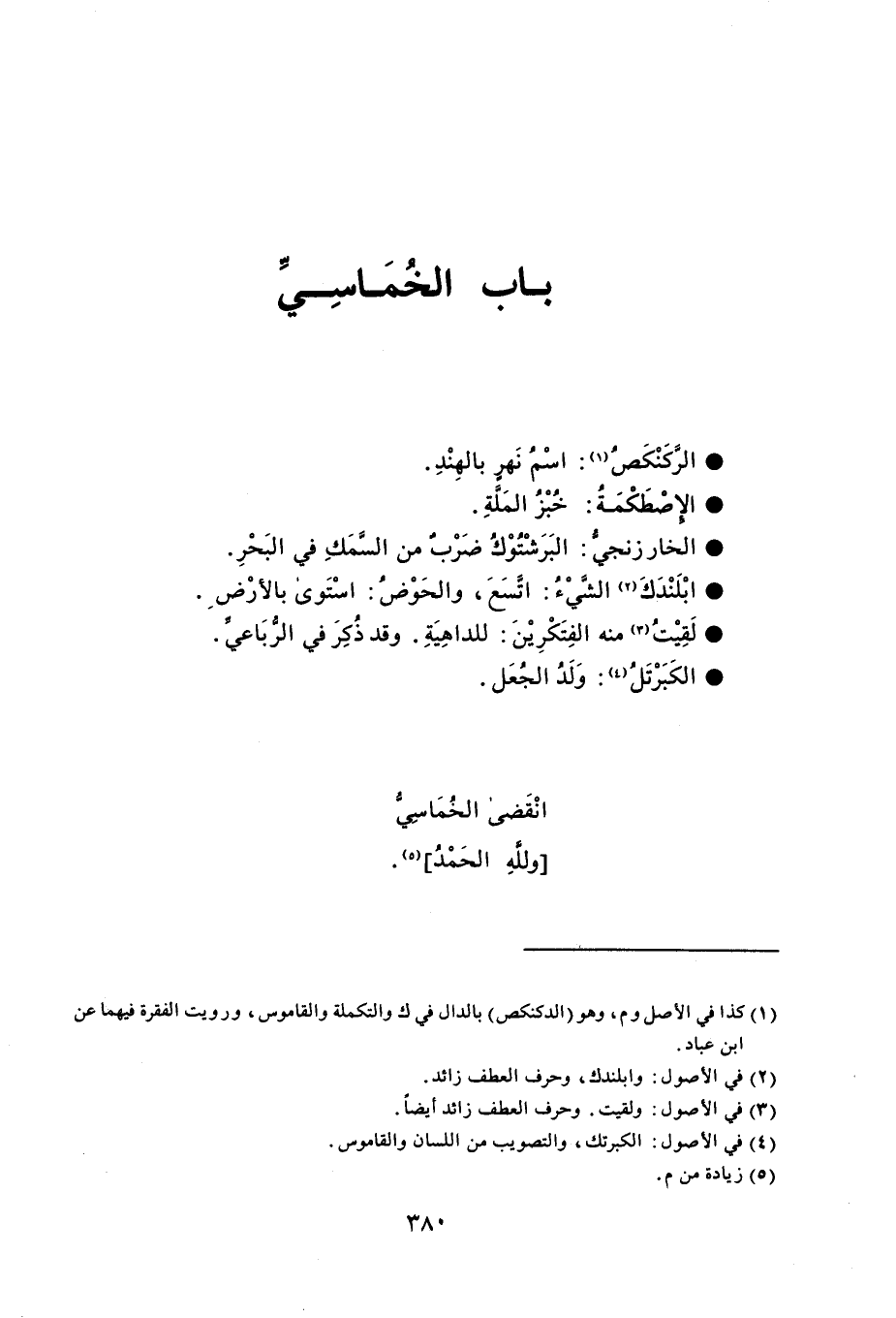 ِّ الرَّكَنْكَصُ اسْمُ نَهرٍ بالهِنْدِ . الإِصْطَكْمَةُ خُبْزُ المَلّةِ . الخارزنجيُّ البَرَشْتُوْكُ ضَرْبٌ من السَّمَكِ في البَحْرِ . ابْلَنْدَكَ الشَّيْءُ اتَّسَعَ ، والحَوْضُ اسْتَوى بالأرْضِ . لَقِيْتُ منه الفِتَكْرِيْنَ للداهِيَةِ . وقد ذُكِرَ في الرُبَاعيِّ . الكَبَرْتَلُ وَلَدُ الجُعَل . انْقَضى الخُمَاسِيُّ وللهِ الحَمْدُ .