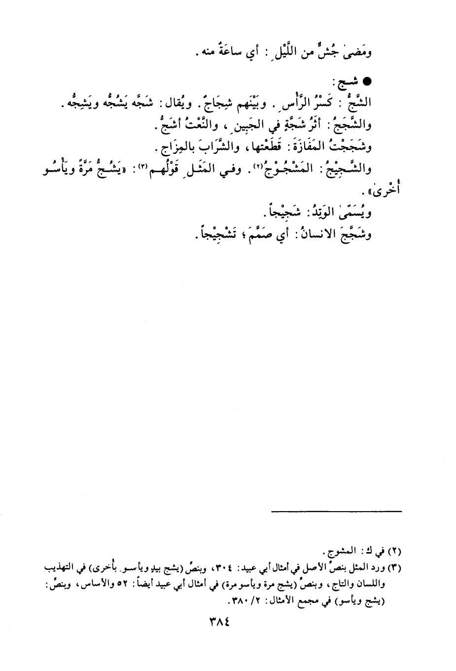 ومَضى جشٌّ من اللَّيْل : أي ساعَةٌ منه . شج الشَّجّ : كَسْرُ الرَّأْس . وبَيْنَهم شِجَاجٌ . ويُقال : شَجَّه يَشُجُّه ويَشِجُّه . والشَّجَجُ : أثَرُ شَجَّةٍ في الجَبِين ، والنَّعْتُ أشَجُّ . وشَجَجْتُ المَفَازَةَ : قَطَعْتها ، والشَّرَابَ بالمِزَاج . والشَّجِيْجُ : المَشْجُوْجُ . وفي المَثَل قَوْلُهم : ' يَشُجُّ مَرَّةً ويَأْسُو أُخْرى ' . ويُسَمّى الوتِدُ : شَجِيْجاً . وشَجَّجَ الانسانُ : أي صَمَّمَ تَشْجِيْجاً .