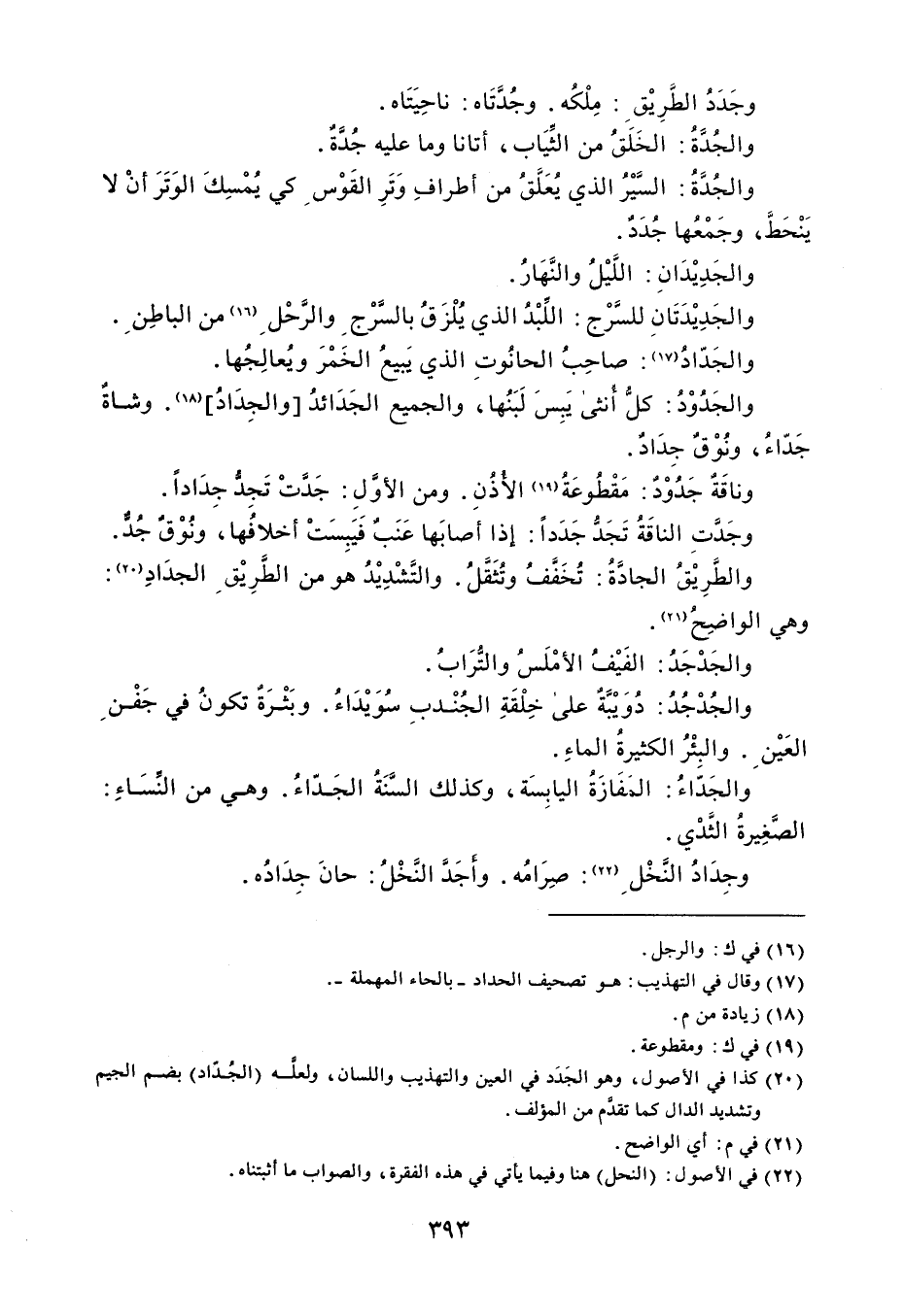 وجَدَدُ الطَّرِيْق : مِلْكُه . وجُدَّتَاه : ناحِيَتَاه . والجُدَّةُ : الخَلَقُ من الثِّيَاب ، أتانا وما عليه جُدَّةٌ . والجُدَّةُ : السَّيْرُ الذي يُعَلَّقُ من أطرافِ وَتَرِ القَوْس كي يُمْسِكَ الوَتَرَ أنْ لا يَنْحَطَّ ، وجَمْعُها جُدَدٌ . والجَدِيْدَانِ : القَيْلُ والنَهَارُ . والجَدِيْدَتَانِ للسَّرْج : اللِّبْدُ الذي يُلْزَقُ بالسَّرْج والرَّحْل من الباطِن . والجَدّادُ : صاحِبُ الحانُوتِ الذي يَبيعُ الخَمْرَ ويُعالِجُها . والجَدُوْدُ : كلُّ أنثى يَبِسَ لَبَنُها ، والجميع الجَدَائدُ والجِدَادُ . وشاةٌ جَداءُ ، ونُوْقٌ جِدَادٌ . وناقَةٌ جَدُوْدٌ : مَقْطُوعَةُ الأُذُنِ . ومن الأوَّلِ : جَدَّتْ تَجِدُ جِدَاداً . وجَدَّتِ الناقَةُ تَجَدُّ جَدَداً : إذا أصابَها عَنَبٌ فَيَبِسَتْ أخلافُها ، ونُوْق جُدٌ . والطَّرِيْقُ الجادَّةُ : تُخَفَّفُ وتُثَقَّلُ . والتَّشْدِيْدُ هو من الطَّرِيْق الجدَادِ : وهي الواضِحُ . والجَدْجَدُ : الفَيْفُ الأمْلَسُ والتُّرَابُ . والجُدْجُدُ : دُوَيْبَّةٌ على خِلْقَةِ الجُنْدبِ سُوَيْدَاءُ . وبَثْرَةٌ تكونُ في جَفْن العَيْن . والبئْرُ الكثيرةُ الماءِ . والجَدَّاءُ : المَفَازَةُ اليابِسَة ، وكذلك السَّنَة الجَدّاءُ . وهي من النَسَاءِ : الصَّغِيرةُ الثَّدْي . وجِدَادُ النَّخْل : صِرَامُه . وأَجَدَّ النَّخْلُ : حانَ جِدَادُه .