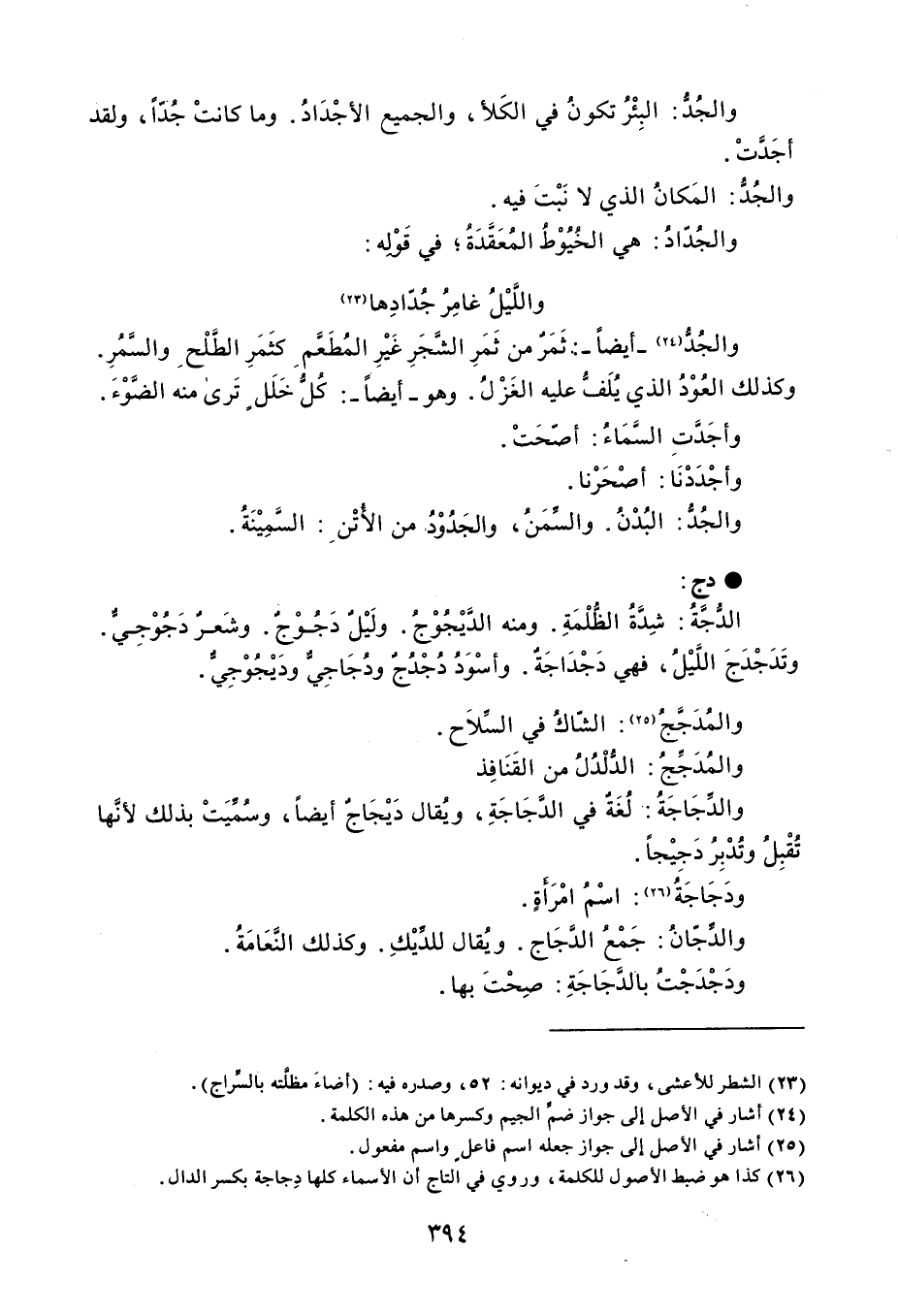 والجُدُّ : البِئْرُ تكونُ في الكَلأ ، والجميع الأجْدَادُ . وما كانتْ جُدّاً ، ولقد أجَدَّتْ . والجُدُّ : المَكانُ الذي لا نَبْتَ فيه . والجُدّادُ : هي الخُيُوْطُ المُعَقَّدَةُ ، في قَوْله : واللَّيْلُ غامِرُ جُدّادِها والجُدُّ - أيضاً - . ثَمَر من ثَمَرِ الشَّجَرِ غَيْرِ المُطَعَّم كثَمَرِ الطَّلْح والسَّمُرِ . وكذلك العُوْدُ الذي يُلَفُّ عليه الغَزْلُ . وهو - أيضاً - : كُلُّ خَلَلٍ تَرى منه الضَّوْءَ . وأجَدَّتِ السَّمَاءُ : أصّحَتْ . وأجْدَدْنَا : أصْحَرْنا . والجُدُّ : البُدْنُ ، والسِّمَنُ ، والجدُوْدُ من الأُتْن : السَّمِيْنَةُ . دج الدُّجَّة : شِدَّةُ الظُّلْمَةِ . ومنه الدَّيْجُوْجُ . ولَيْل دَجُوْجٌ . وشَعرٌ دَجُوْجِيٌّ . وتدَجْدَجَ اللّيْلُ ، فهي دَجْدَاجَةٌ . وأسْوَدُ دُجْدُجٌ ودُجَاجِيٌّ ودَيْجُوْجِيٌّ . والمُدَجَّجُ : الشّاكُ في السِّلاَح . والمُدَجَّجُ : الدُّلْدُلُ من القَنَافِذ . والدِّجَاجَةُ : لُغَةٌ في الدَّجَاجَةِ ، ويُقال دَيْجَاجٌ أيضاً ، وسُمِّيَتْ بذلك لأنَّها تُقْبِلُ وتُدْبِرُ دَجِيْجاً . ودَجَاجَةُ : اسْمُ امْرَأَةٍ . والدَّجّانُ : جَمْعُ الدَّجَاج . ويُقال للدِّيْكِ . وكذلك النَّعَامَةُ . ودَجْدَجْتُ بالدَّجَاجَةِ : صِحْتَ بها .