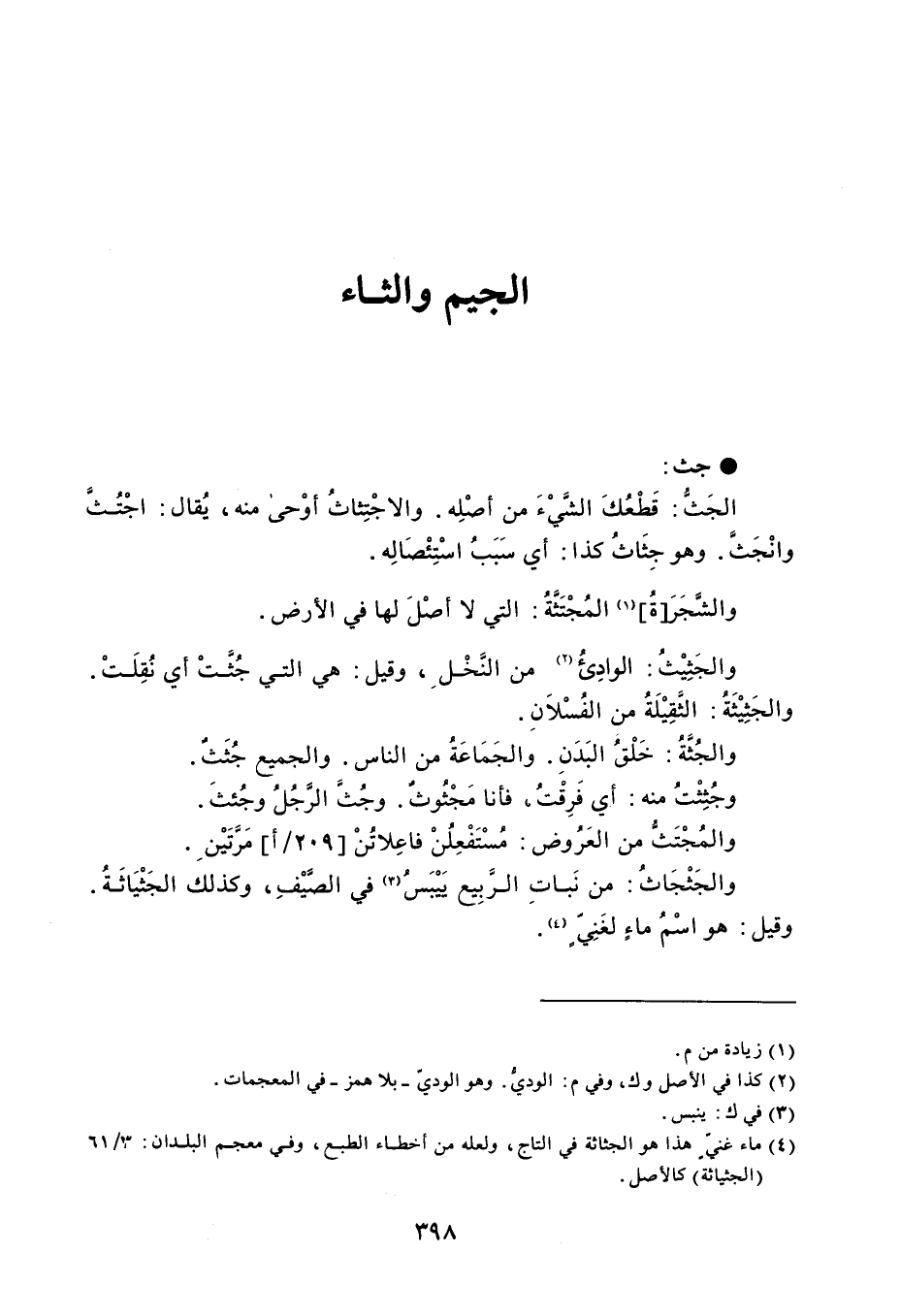 جث الجَثُّ : قَطْعُكَ الشَّيْءَ من أصْلِه . والاجْتِثاثُ أوْحى منه ، يُقال : اْجَتُثَّ . وانْجّثَّ وهو جِثَاثُ كذا : أي سَبَبُ اسْتِئْصَالِه . والشَّجَرةُ ، المُجْتثَّةُ : التي لا أصْلَ لها في الأرض . والجَثِيْثُ : الوادِيُ من النَّخْل ، وقيل : هي التي جُثَّتْ أي نُقِلَتْ . والجَثِيْثَةُ : الثَّقِيْلَةُ من الفُسْلاَنِ . والجُثَّةُ : خَلْقُ البَدَنِ . والجَمَاعَةُ من الناس . والجميع جُثَثٌ . وجُثِثْتُ منه : أي فَرِقْتُ ، فأنا مَجْثُوثٌ . وجُثَّ الرَّجُلُ وجُئثَ . والمُجْتَثُّ من العَرُوض : مُسْتَفْعِلُنْ فاعِلاتُنْ مَرَّتَيْن . والجَثْجَاثُ : من نَباتِ الرَّبِيع يَيْبَسُ في الصَّيْفِ ، وكذلك الجَثْيَاثَةُ . وقيل : هو اسْمُ ماءٍ لغَنِيٍّ .