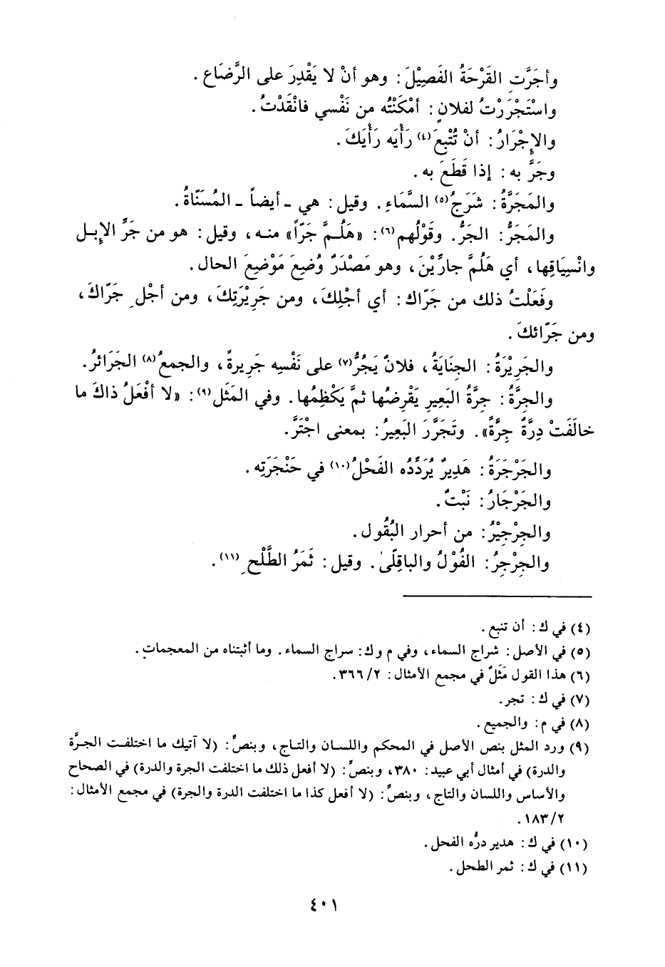 وأجَرَّتِ القَرْحَةُ الفَصِيْلَ : وهو أنْ لا يَقْدِرَ على الرَّضَاع . واسْتَجْرَرْتُ لفلانٍ : أمْكَنْتُه من نَفْسي فانْقَدْتُ . والإجْرَارُ : أنْ تُتْبعَ رَأْيَه رَأْيَكَ . وجَرًّ به : إذا قَطَعَ به . والمَجَرَّةُ : شَرَجُ السَّمَاءِ . وقيل : هي - أيضاً - المُسَنّاةُ . والمَجَرُّ : الجَرُّ . وقَوْلُهم : ' هَلُمَّ جَرّاً ' منه ، وقيل : هو من جَرَ الإِبل وانْسِيَاقِها ، أي هَلُمِّ جارِّيْنَ ، وهو مَصْدَرٌ وُضِعَ مَوْضِعَ الحال . وفَعَلْتُ ذلك من جَرّاك : أي أجْلِكَ ، ومن جَرِيْرَتِكَ ، ومن أجْل جَرّاكَ ، ومن جَرّائكَ . والجَرِيْرَةُ : الجِنَايَةُ ، فلان يَجُرُّ على نَفْسِه جَرِيرةً ، والجمعُ الجَرَائرُ . والجِرَّةُ : جِرَّةُ البَعِيرِ يَقْرِضُها ثمَّ يَكْظِمُها . وفي المَثَل : ' لا أفْعَلُ ذاكَ ما خالَفَتْ دِرَّةٌ جِرَّةً ' . وتَجَرَّرَ البَعِيرُ : بمعنى اجْتَرَّ . والجَرْجَرَةُ : هَدِيرٌ يُرَدِّدُه الفَحْلُ في حَنْجَرَتِه . والجَرْجَارُ : نَبْتٌ . والجِرْجِيْرُ : من أحرار البُقُول . والجِرْجِرُ : الفُوْلُ والباقِلّى . وقيل : ثَمَرُ الطَّلْحِ .