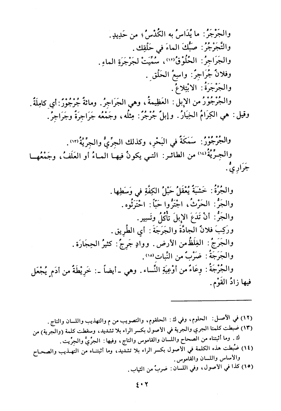 والجَرْجَرُ : ما يُدَاسُ به الكُدْسُ من حَدِيدٍ . والتَّجَرْجُرُ : صَبُّكَ الماءَ في حَلْقِك . والجَرَاجِرُ : الحُلُوْقُ ، سُمَّيَتْ لجَرْجَرَةِ الماءِ . وفلانٌ جُرَاجِرٌ : واسِعُ الحَلْقَ . والجَرْجَرَةُ : الابْتِلاعُ . والجُرْجُوْرُ من الإِبل : العَظِيمةُ ، وهي الجَرَاجِرُ . ومائةٌ جُرْجُوْرٌ : أي كامِلَةٌ . وقيل : هي الكِرَامُ الخِيَارُ . وإبلٌ جُرْجُرٌ : مِثلُه ، وجَمْعُه جَرَاجِرَةٌ وجَرَاجِرُ . والجُرْجُوْرُ : سَمَكَةٌ في البَحْرِ ، وكذلك الجِرِّيُّ والجِريَّةُ . والجِرِّيَّةُ من الطائر : التي يكونُ فيها الماءُ أو العَلَفُ ، وجَمْعُها جَرَارِيُ . والجُرَّةُ : خَشَبَةٌ يُعْقَلُ حَبْلُ الكِفَّةِ في وَسَطِها . والجَرُّ : الحَرْثُ ، اجْتَروا حَباً : احْتَرَثُوه . والجَرُّ : أنْ تَدَع الإِبلَ تأكُلُ وتَسِير . ورَكِبَ فلان الجادَّةَ والجَرَجَةَ : أي الطَّرِيق . والجَرَجُ : الغِلَظُ من الأرض . ووادٍ جَرِجٌ : كثيرُ الحِجَارَة . والجَرَجَةُ : ضَرْبٌ من النَّباتِ . والجُرْجَةُ : وِعَاءٌ من أوْعِيَةِ النِّساء . وهي - أيضاً - : خَرِيْطَةٌ من أدَم يُجْعَل فيها زادُ القَوْم .