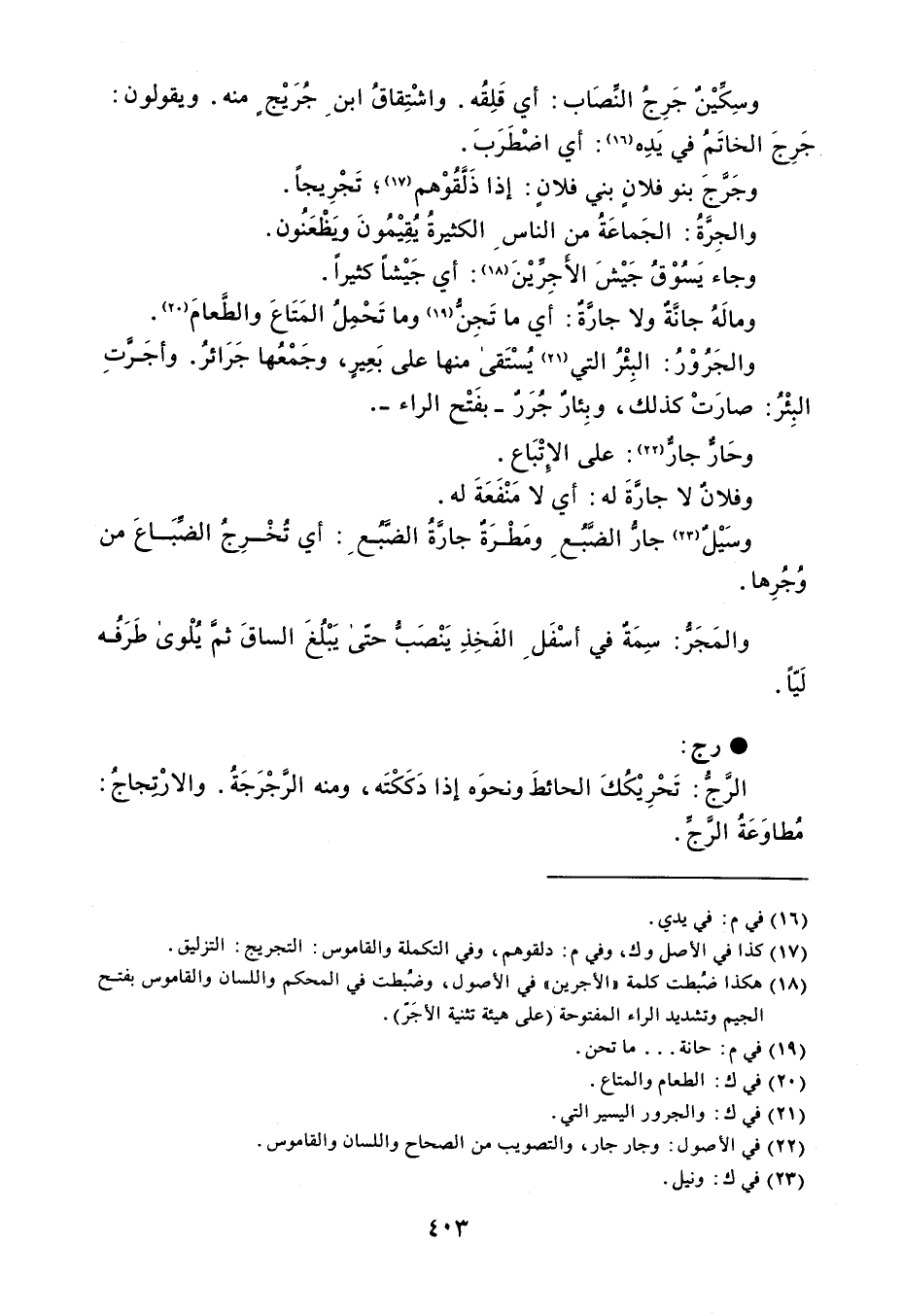 وسِكِّيْنٌ جَرِجُ النِّصَاب : أي قَلِقُه . واشْتِقاقُ ابن جُرَيْج منه . ويقولون : جَرِجَ الخاتَمُ في يَدِه : أي اضْطَرَبَ . وجَرَّج بنو فلانٍ بني فلانٍ : إذا ذَلَّقُوْهم تَجْرِيجاً . والجِرَّةُ : الجَماعَةُ من الناس الكثيرةُ يُقِيْمُونَ ويَظْعَنُون . وجاء يَسُوْقُ جَيْشَ الأَجِرِّيْنَ : أي جَيْشاً كثيراً . ومالَهُ جانَةٌ ولا جارَّةٌ : أي ما تَجِنُّ وما تَحْمِلُ المَتَاعَ والطعامَ . والجَرُوْرُ : البِئْرُ التي يُسْتَقى منها على بَعِيرٍ ، وجَمْعُها جَرَائرُ . وأجَرَّتُ البِئْرُ : صارَتْ كذلك ، وبِئارٌ جُرَرٌ - بفَتْح الراء - . وحَارٌّ جارٌّ : على الإِتْبَاع . وفلانٌ لا جازَةَ له : أي لا مَنْفَعَةَ له . وسَيْلٌ جارُّ الضَّبُع ومَطْرَةٌ جارَّةُ الضبع : أي تُخْرِجُ الضِّبَاعَ من وُجُرِها . والمَجَرُّ : سِمَةٌ في أسْفَل الفَخِذِ يَنْصَبُّ حتّى يَبْلُغَ الساقَ ثمَّ يُلْوى طَرَفُه لَيّاً . رج الرَّجّ : تَحْرِيْكُكَ الحائطَ ونحوَه إذا دَكَكْتَه ، ومنه الرَّجْرَجَةُ . والارْتِجاجُ : مُطاوَعَةُ الرَّجِّ .
