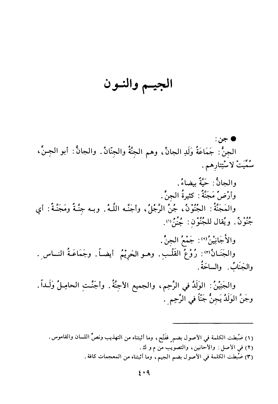 جن الجِنُّ : جَمَاعَةُ وَلَدِ الجانِّ ، وهم الجِنَّةُ والجِنّانُ . والجانُّ : أبو الجِنِّ ، سُمِّيَتْ لاسْتِتارِهم . والجانُّ : حَيَّةٌ بيضاءُ . وأرْضٌ مَجَنَةٌ : كثيرةُ الجِنِّ . والمَجَنَّةُ : الجُنُوْنُ ، جُنَّ الرَّجُلُ ، وأجَنَّه اللَّهُ . وبه جِنَّةٌ ومَجَنَّةٌ : أي جُنُوْنٌ . ويُقال للجُنُوْنِ : جُنُنٌ . والأَجَانِيْنُ : جَمْعُ الجِنِّ . والجَنَانُ : رُوْعُ القَلْبِ . وهو الحَرِيْمُ أيضاً . وجَمَاعَةُ الناس . والجَنَابُ . والساحَةُ . والجَنِيْنُ : الوَلَدُ في الرَّحِم ، والجميع الأجِنَّةُ . وأجَنَّتِ الحامِلُ وَلَداً . وجَنَّ الوَلَدُ يَجِنُّ جَنّاً في الرَّحِمَ .