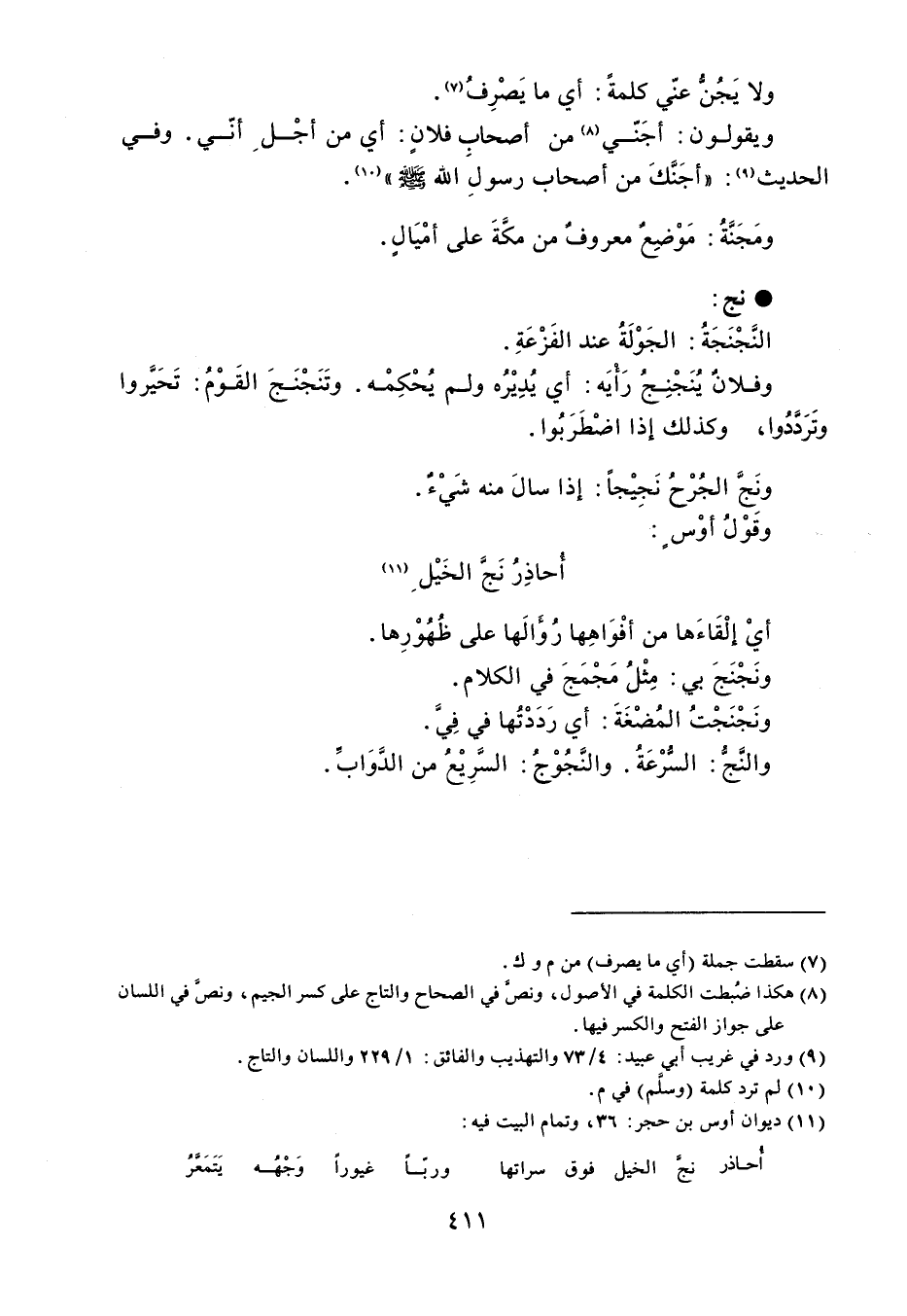 ولا يَجُنُّ عنّي كلمةً : أي ما يَصْرِفُ . ويقولون : أجَنّي من أصحاب فلانٍ : أي من أجْلِ أنّي . وفي الحديث : ' أجَنَّكَ من أصحاب رسولَ اللهّ e ' . ومَجَنَةُ : مَوْضِعٌ معروفُ من مكَةَ على أمْيَالٍ . نج النَّجْنَجَةُ : الجَوْلَةُ عند الفَزْعَةِ . وفلانٌ يُنَجْنِجُ رَأْيَه : أي يُدِيْرُه ولم يُحْكِمْه . وتَنَجْنَجَ القَوْمُ : تَحَيَّروا وتَرَدَّدُوا ، وكذلك إذا اضْطَرَبُوا . ونَجَّ الجُرْحُ نَجِيْجاً : إذا سالَ منه شَيْءٌ . وقَوْلُ أوْسٍ : أحاذِرُ نَجَّ الخَيْلِ أيْ إلْقَاءَها من أفْوَاهِها رُؤَالَها على ظُهُوْرِها . ونَجْنَجَ بي : مِثْلُ مَجْمَجَ في الكلام . ونَجْنَجْتُ المُضْغَةَ : أي رَدَدْتُها في فِيَّ . والنَّجُّ : السُّرْعَةُ . والنَّجُوْجُ : السَّرِيْعُ من الدَّوَابِّ .