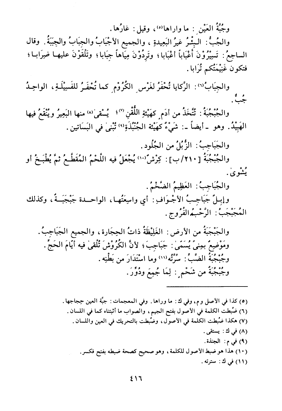 وجُبَّةُ العَيْن : ما واراها ، وقيل : غارُها . والجُبُّ : البِئْرُ غيرُ البَعِيدةِ ، والجميع الأجْبَابُ والجِبَابُ والجِبَبَةُ . وقال الساجعُ : تَسِيْرُوْنَ أَغْبَابَاَ أغْبَابا ، وتَرِدُوْنَ مِيَاهاً جِبَابا وتَلْقَوْنَ عليها ضِرَابا فتكون غَنِيْمَتُكم تُرَابا . والجِبَابُ : الرَّكايا تُحْفَرُ لغَرْس الكُرُوْم كما تُحْفَرُ للفَسِيْلَةِ ، الواحِدُ جبٌّ . والجُبْجُبَةُ : تُتَخَذُ من أدَم كهَيْئة اللُّقْنِ يُسْقى منها البَعِيرُ ويُنْقَعُ فيها الهَبِيْدُ . وهو - أيضَاً - : شَيْءٌ كهَيْئة الجُنْبُذَةِ تُبْنى في البَسَاتين . والجَبَاجِبُ : الزُّبُلُ من الجُلُود . والجُبْجُبَةُ : كِرْشٌ يُجْعَلُ فيه اللَّحْمُ المُقطَّعُ ثمَّ يُطْبَخُ أو يُشْوى . والجُبَاجِبُ : العَظِيمُ الضَّخْمُ . وإبِلٌ جَبَاجِبُ الأجْوَافِ : أي واسِعَتُها ، الواحدة جَبْجَبَةٌ ، وكذلك المُجَبْجَبُ : الرَّحْبُ الفُرُوج . والجَبْجَبَةُ من الأرض : الغَلِيْظَةُ ذاتُ الحِجَارة ، والجميع الجَبَاجبُ . ومَوْضِعٌ بمِنىً يُسَمّى : جَبَاجِبَ لأنَّ الكُرُوْشَ تُلْقى فيه أيّامَ الحَجِّ . وجُبْجُبَةُ الضَّبِّ : سُرَّتُه وما اسْتَدَارَ من بَطْنِه . وجُبْجُبَةٌ من شَحْم : لِمَا جُمِعَ ودُوِّرَ .