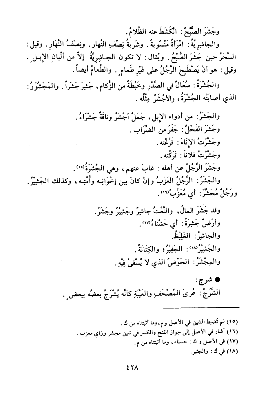 وجَشَرَ الصُّبْحُ : انْكَشَطَ عنه الظَّلامُ . والجاشِرِيَّةُ : امْرَأةٌ مَنْسُوبةٌ . وشَربةُ نِصْفِ النَّهار . ونِصْفُ النَهَارِ . وقيل : السَّحَرُ حين جَشَرَ الصُّبْحُ . ويُقال : لا تكون الجاشِرِيَّةُ إلاّ من ألْبانِ الإِبل . وقيل : هو أنْ يَصْطَبحَ الرجُلُ على غَيْرِ طَعامٍ . والطعامُ أيضاً . والجُشْرَةُ : سُعَالٌ في الصَّدْرِ وخَبْطَةٌ من الزُّكام ، جَشِرَ جَشَراً : والمَجْشُوْرُ : الذي أصابَتْه الجُشْرَةُ ، والأجْشَرُ مِثْلُه . والجَشَرُ : من أدواء الإِبل ، جَمَل أجْشَرُ وناقَةٌ جَشْرَاءُ . وجَشَرَ الفَحْلُ : جَفَرَ من الضِّرَاب . وجَشَّرْتُ الإِنَاءَ : فَرَّغْته . وجَشَّرْتُ فلاناً : تَرَكْته . وجَشَرَ الرجُلُ عن أهله : غابَ عنهم ، وهي الجُشَرَةُ . والجَشَرُ : الرَّجُل العَزَبُ وإنْ كانَ بين إخْوَانِه وأُمَّتِه ، وكذلك الجَشِيْرُ . ورَجُلٌ مُجَشِّرٌ : أي مُعَزِّبٌ . وقد جَشَرَ المالُ ، والنَعْتُ جاشِرٌ وجَشِيْر وجَشَرٌ . وأرْضٌ جَشِرَةٌ : أي خَشْنَاءُ . والجا شِرُ : الغَلِيْظُ . والجَشِيْرُ : الجَفِيْرُ والكِنَانَةُ . والمِجْشَرُ : الحَوْضُ الذي لا يُسْقى فِيْهِ . شرج الشَّرَجُ : عُرى المُصْحَفِ والعَيْبَةِ كأنَّه يُشْرَجُ بعضُه ببعض .