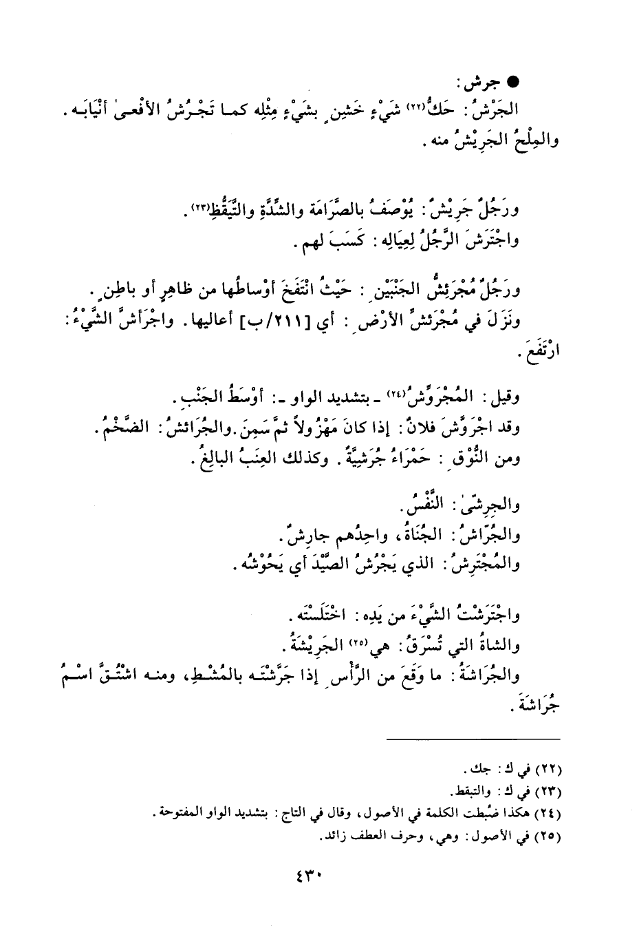 جرش الجَرْشُ : حَكُّ شَيْءٍ خَشِن بشَيْءٍ مِثْلِه كما تَجْرُشُ الأفْعى أنْيَابَه . والمِلْحُ الجَرِيْشُ منه . ورَجُلٌ جَرِيْشٌ : يُوْصَفُ بالصَّرَامَة والشَدَّةِ والتَّيَقُظِ واجْتَرَشَ الرَّجُلُ لِعِيَالِه : كَسَبَ لهم . ورَجُلٌ مُجْرَئِشُّ الجَنْبَيْن : حَيثُ انْتَفَخَ أوْساطُها من ظاهِرٍ أو باطِن . ونَزَلَ في مُجْرَئشِّ الأرْض : أي أعاليها . واجْرَأشَّ الشَّيْءُ : ارْتَفَعَ . وقيل : المُجْرَوِّشُ - بتشديد الواو - : أوْسَطُ الجَنْبِ . وقد اجْرَوَّشَ فلانٌ : إذا كانَ مَهْزُولاً ثمَّ سَمِنَ . والجُرَائشُ : الضَّخْمُ . ومن النُّوْق : حَمْرَاءُ جُرَشِيَّةٌ . وكذلك العِنَبُ البالِغُ . والجِرِشّى : النَفْسُ . والجُرّاشُ : الجُنَاةُ ، واحِدُهم جارِشٌ . والمُجْتَرِشُ : الذي يَجْرُشُ الصَّيْدَ أي يَحُوْشُه . واجْتَرَشْتُ الشَّيْءَ من يَدِه : اخْتَلَسْتَه . والشاةُ التي تُسْرَقُ : هي الجَرِيْشَةُ . والجُرَاشَةُ : ما وَقَعَ من الرَّأسِ إذا جَرَّشْتَه بالمُشْطِ ، ومنه اشْتُق اسْمُ جُرَاشَةَ .