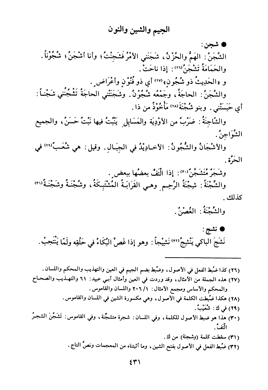 شجن الشَّجَنُ : الهَمُّ والحُزْنُ ، شَجَنَني الأمْرُ فَشَجِنْتُ وأنا أشْجَنُ شُجُوْناً . والحَمَامَةُ تَشْجَنُ : إذا ناحَتْ . والحَدِيثُ ذو شُجُونٍ : أي ذو فُنُوْنٍ وأعْرَاضٍ . والشَّجَنُ : الحاجَةُ ، وجَمْعُه شُجُوْن . وشَجَنَتْني الحاجَةُ تَشْجُنني شَجْناً : أي حَبَسَتْني . وبنو شُجْنَةَ مَأخُوْذٌ من ذا . والشّاجِنَةُ : ضَرْبٌ من الأوْدِيَة والمَسَايِل يَنْبُتُ فيها نَبْتٌ حَسَن ، والجميع الشَّوَاجِنُ . والأشْجَانُ والشُّجُونُ : الأخادِيْدُ في الجِبَالِ . وقيل : هي شُعَبٌ في الحَرَّة . وشَجَرٌ مُتَشَجَّن : إذا الْتَفَّ بعضُها ببعض . والشِّجْنَةُ : شِجْنَةُ الرَّحِم وهي القَرَابَةُ المُشْتَبِكَة ، وشُجْنَةٌ وشَجْنَةٌ كذلك . والشِّجْنَةُ : الغُصْنُ . نشج نَشَجَ الباكي يَنْشِجُ نَشِيْجاً : وهو إذا غَصَّ البُكَاءُ في حَلْقِه ولَمّا يَنْتَحِبْ .