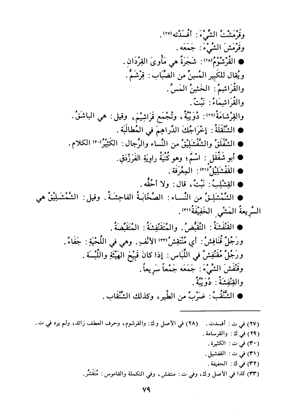 وقَرْمَشْتُ الشَّيْءَ : أفْسَدْته . وقَرْمَشَ الشَّيْءَ : جَمَعَه . القُرْشُوْمُ شَجَرَةٌ هي مَأْوى القِرْدَانِ . ويُقال للكَبِير المُسِن من الضِّبَاب : قِرْشَمٌّ . والقُرَاشِمُ : الخَشِنُ المَسِّ . والقُرَاشِمَاءُ : نَبْتٌ . والقِرْشامَةُ : دُوَيْبَّةٌ ، وتُجْمَع قَرَاشيْمَ ، وقيل : هي الباشَقُ . الشَّنْقَلَةُ إخْرَاجُكَ الدَّراهِمَ في المُطالَبَة . الشَّفْلَقُ والشَّفْشَلِيْقُ من النِّساء والرِّجال الكَثِيْرُ الكلام . أبو شَفْقَلٍ اسْمٌ وهو كُنْيَةُ راوِيَةِ الفَرَزْدَقِ . القَفْشَلِيْلُ المِغْرَفَة . القِشْلِبُ نَبْتٌ ، قال ولا أحُقُّه . الشَّمْشَلِقُ من النَساء الصَّخّابَةُ الفاحِشَةُ . وقيل الشَّمْشَلِيْقُ هي السَّرِيعةُ المَشْي الخَفِيْفَةُ . القَنْفَشَةُ التَّقَبُّضُ . والمُتَقَنْفِشَةُ المُتَقَبِّضَةُ . ورَجُلٌ قُنَافِشُ : أي مُنْتَقِشُ الأنْفِ . وهي في اللِّحْيَةِ : جَفَاءٌ . ورَجُل مُقَنْفِشٌ في اللَّبَاس : إذا كانَ قَبِيْحَ الهَيْئَةِ واللِّبْسَة . وقَنْفَشَ الشَّيْءَ : جَمَعَه جَمْعاً سَرِيعاً . والقِنْفِشَةُ : دُوَيْبَّةٌ . الشُّنْقُبُ ضَرْبٌ من الطير ، وكذلك الشِّنْقَاب .