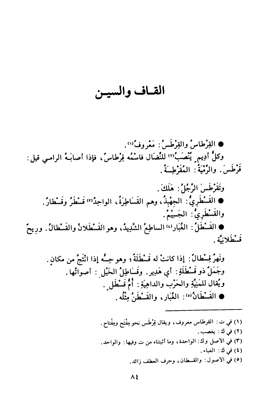 القِرطاسُ والقِرْطَسُ مَعْروفٌ . وكلُّ أدِيم يُنْصَبُ للنِّضَال فاسْمُه قِرْطاسٌ ، فإذا أصابَهُ الرامي قيل : قَرْطَسَ . والرَّمْيَةُ : المُقَرْطِسَةُ . وتَقَرْطَسَ الرجُلُ : هَلَكَ . القَسْطَرِيُ الجِهْبِذُ ، وهم القَسَاطِرَةُ ، الواحِدُ قَسْطرٌ وقَسْطارٌ . والقَسْطَرِيُّ : الجَسِيْمُ . القَسْطَلُ الغُبَار ، الساطِعُ الشَّدِيدُ ، وهو القَسْطَلانُ والقَسْطالُ . ورِيحٌ قسْطَلانِيَّة . ونَهرٌ قِسْطالٌ : إذا كانتْ له قَسْطَلَةٌ وهو حِسُّه إِذا انْثَجَّ من مكانٍ . وجَمَلٌ ذو قَسْطَلَةٍ : أي هَدِير . وقَسَاطِلُ الخيْل : أصواتُها . ويُقال للمَنِيَّةِ والحَرْب والداهِيَةِ : أُمُّ قَسْطلٍ . القَسْطَانُ الغُبَار ، والقَسْطَنُ مِثْلُه .
