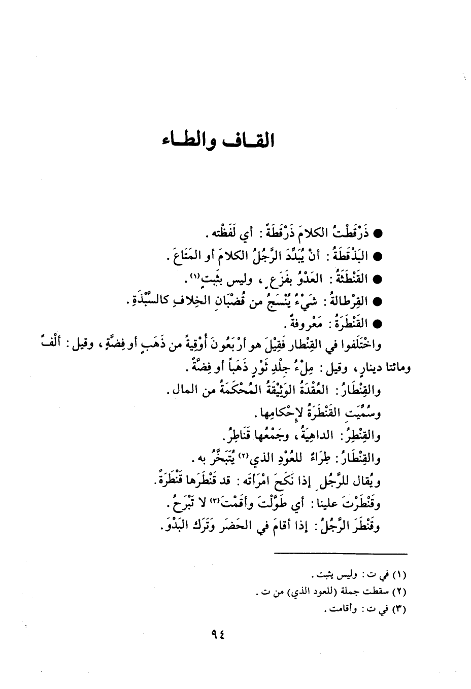 ذَرْقَطْتُ الكلامَ ذَرْقَطَةً أي لَفَظْته . البَذْقَطَةُ أنْ يُبَدِّدَ الرَّجُلُ الكلامَ أو المَتَاعَ . القَنْطَثَةُ العَدْوُ بفَزَعٍِ ، وليس بثَبتٍ . القِرْطالةُ شَيْءٌ يُنْسجُ من قُضْبَانِ الخِلافِ كالسَّبْذَةِ . القَنْطَرَةُ مَعْروفة . واخْتَلَفوا في القِنْطار فَقِيْلَ هو أرْبَعُونَ أُوْقيةً من ذَهَبٍ أو فِضَّةٍ ، وقيل : ألفٌ ومائتا دينارٍ ، وقيل : مِلْءُ جِلْدِ ثَوْرٍ ذَهَباً أو فِضَّةً . والقِنْطَارُ : العُقْدَةُ الوَثيْقَةُ المُحْكَمَةُ من المال . وسُمِّيَتِ القَنْطَرَةُ لإِحْكامِها . والقِنْطِرُ : الداهِيَةُ ، وجَمْعُها قَنَاطِرُ . والقِنْطَارُ : طِرَاءٌ للعُوْدِ الذي يُتَبَخَّرُ به . ويُقال للرَّجُل إذا نَكَحَ امْرَأتَه : قد قَنْطَرَها قَنْطَرَةً . وقَنْطَرْتَ علينا : أي طَوَّلْتَ وأقَمْتَ لا تَبْرَحُ . وقَنْطَرَ الرجُلُ : إذا أقامَ في الحَضَر وَتَرَك البَدْوَ .