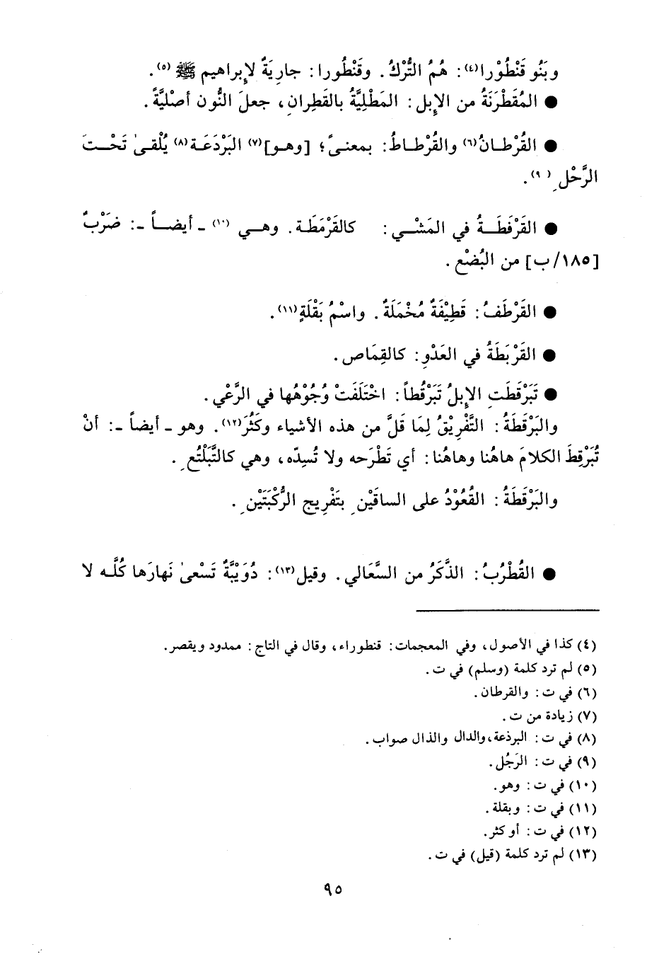 وبَنُو قَنْطُوْرا : هُمُ التُّرْكُ . وقَنْطُورا : جارِيَةٌ لإِبراهيم e . المُقَطْرَنَةُ من الإِبل المَطْلِيَّةُ بالقَطِرانِ ، جعلَ النُّون أصْليَّةً . القُرْطانُ والقُرْطاطُ بمعنىً وهو البَرْدَعَة يُلْقى تَحْتَ الرَّحْلِ . القَرْفَطَةُ في المَشْي كالقَرْمَطَة . وهي - أيضاً - ضَرْبٌ من البُضْع . القَرْطَفُ قَطِيْفَة مُخْمَلَة . واسْمُ بَقْلَةٍ . القَرْبَطَةُ في العَدْوِ كالقِمَاص . تَبَرْقَطَتِ الإِبلُ تَبَرْقُطاً اخْتَلَفَتْ وُجُوْهُها في الرَّعْي . والبَرْقَطَةُ : التَفْرِيْقُ لِمَا قَلَّ من هذه الأشياء وكَثُرَ . وهو - أيضاً - : أنْ تُبَرْقِطَ الكلامَ هاهُنا وهاهُنا : أي تَطْرَحه ولا تُسِدّه ، وهي كالتَّبَلْتُع . والبَرْقَطَةُ : القُعُوْدُ على الساقَيْن بتَفْرِيج الرُكْبَتَيْن . القُطْرُبُ الذَّكَرُ من السَّعَالي . وقيل دُوَيْبَّةٌ تَسْعى نَهارَها كُلَّه لا